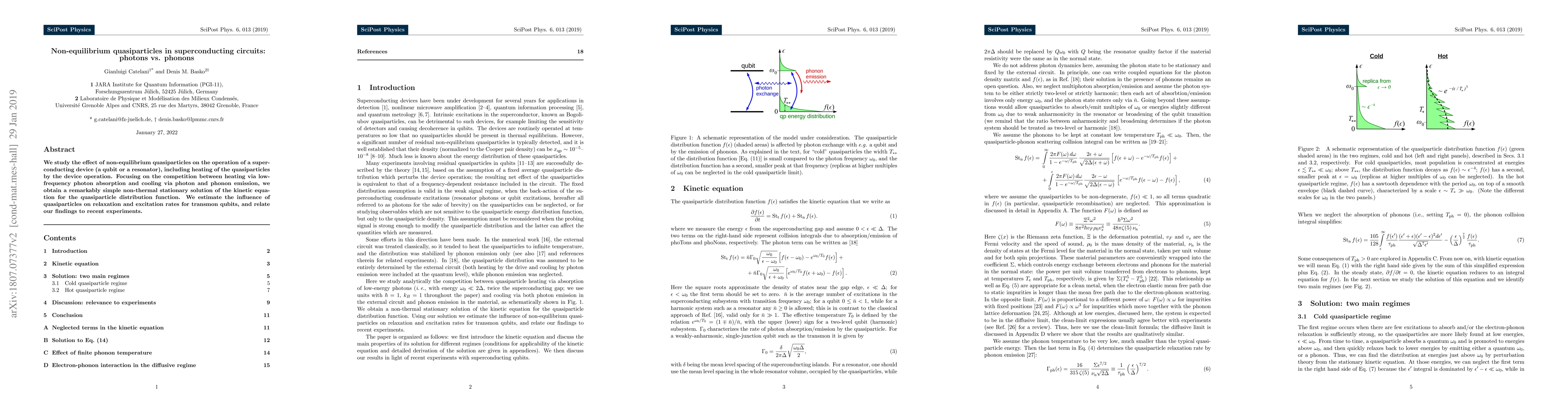 This paper investigates the impact of non-equilibrium quasiparticles on superconducting circuits, comparing photon and phonon heating effects. It finds a simple non-thermal stationary solution for quasiparticle distribution and estimates quasiparticle influence on transmon qubit relaxation and excitation rates, correlating results with recent experimental data.