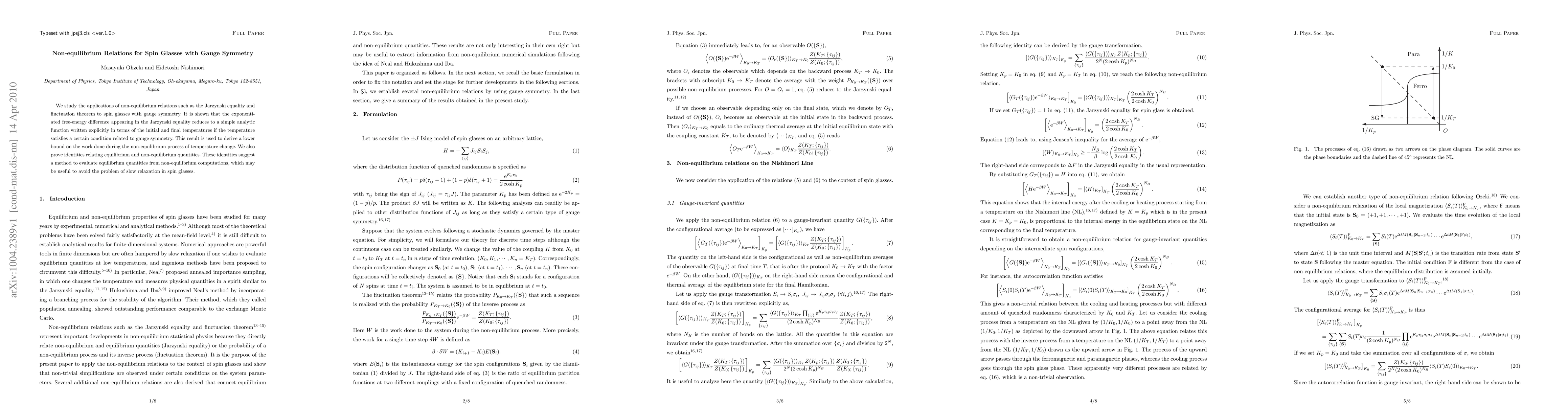 This paper explores the application of non-equilibrium relations to spin glasses with gauge symmetry, revealing an analytic function for the exponentiated free-energy difference under specific temperature conditions. It derives a lower bound on work done during temperature changes and establishes identities linking equilibrium and non-equilibrium quantities, potentially aiding in evaluating equilibrium states without slow relaxation issues.