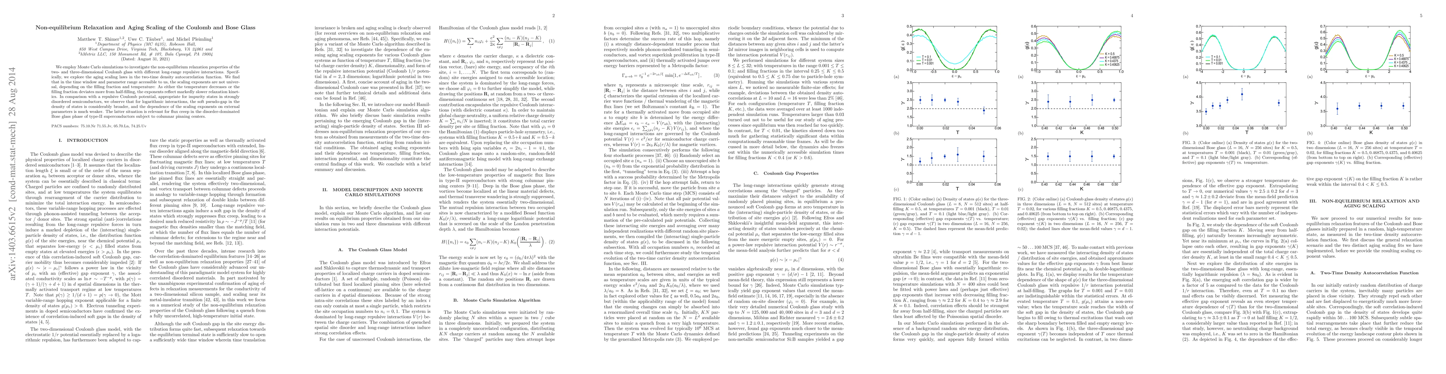 This paper uses Monte Carlo simulations to study non-equilibrium relaxation in Coulomb and Bose glasses, finding that aging scaling exponents vary with temperature and filling fraction, and that logarithmic interactions lead to broader pseudo-gaps and weaker parameter dependence, relevant for flux creep in disordered superconductors.
