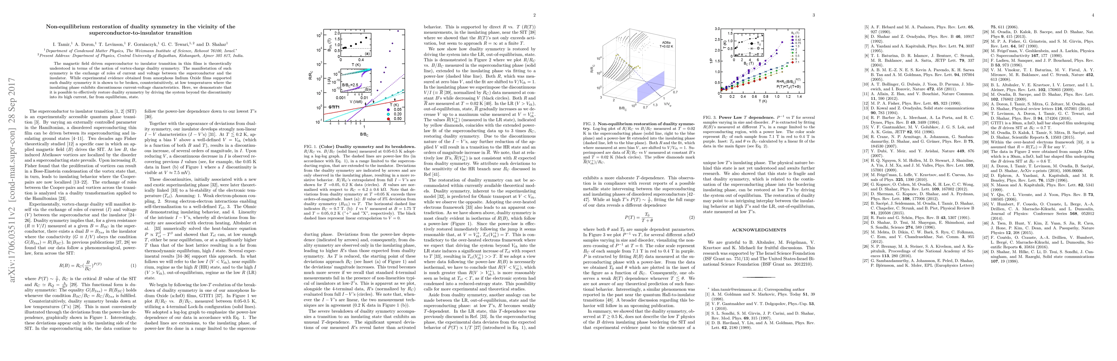 The magnetic field driven superconductor to insulator transition in thin films was theoretically analyzed via a vortex-charge duality transformation applied to the Hamiltonian. Vortices condensation was conjectured as the underline physical mechanism of the insulating phase. Experimental evidence supported duality symmetry across the magnetic-field driven superconductor to insulator transition in amorphous Indium Oxide films. Counterintuitively, duality symmetry is broken at low temperatures where the insulating phase develops strongly non linear current-voltage characteristics. Here, we follow the breakdown of duality symmetry down to very low temperatures and demonstrate the restoration of duality symmetry out of equilibrium.