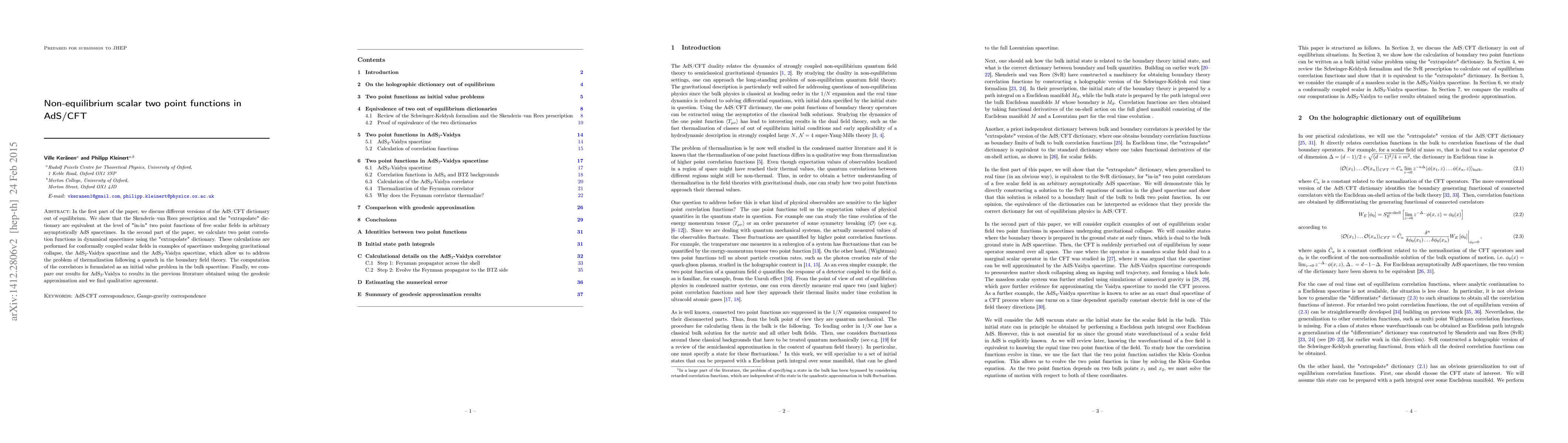 This paper explores the AdS/CFT correspondence for out-of-equilibrium conditions, demonstrating the equivalence of two non-equilibrium dictionaries at the level of "in-in" two-point functions for free scalars. It then calculates these functions in dynamical spacetimes, specifically in AdS$_2$-Vaidya and AdS$_3$-Vaidya, to study thermalization post-quench, finding qualitative agreement with previous geodesic approximation results.