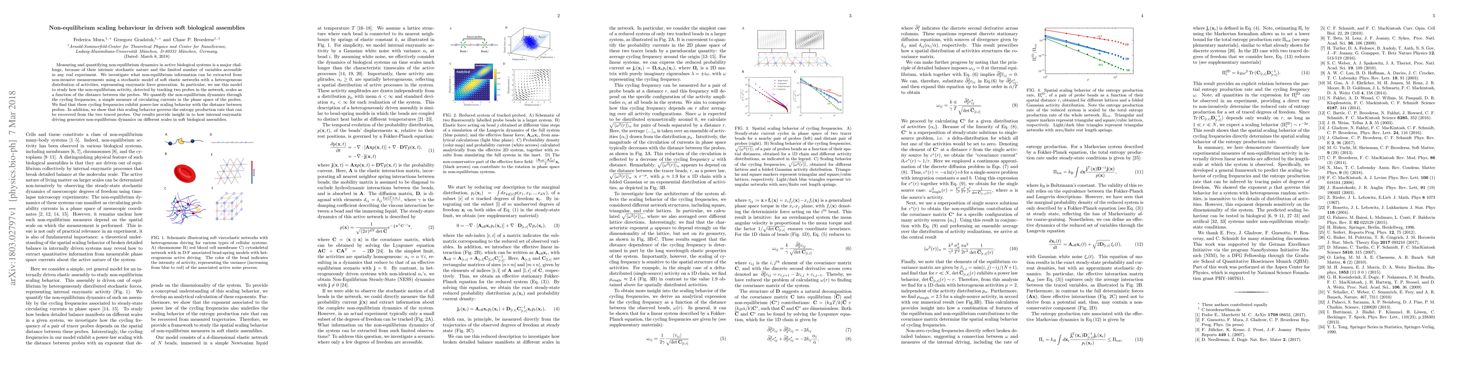 This paper investigates non-equilibrium dynamics in active biological systems using a stochastic model of soft elastic networks, finding power-law scaling behavior in cycling frequencies between probes. The study reveals that this scaling behavior governs entropy production, offering insights into enzymatic driving in biological assemblies.