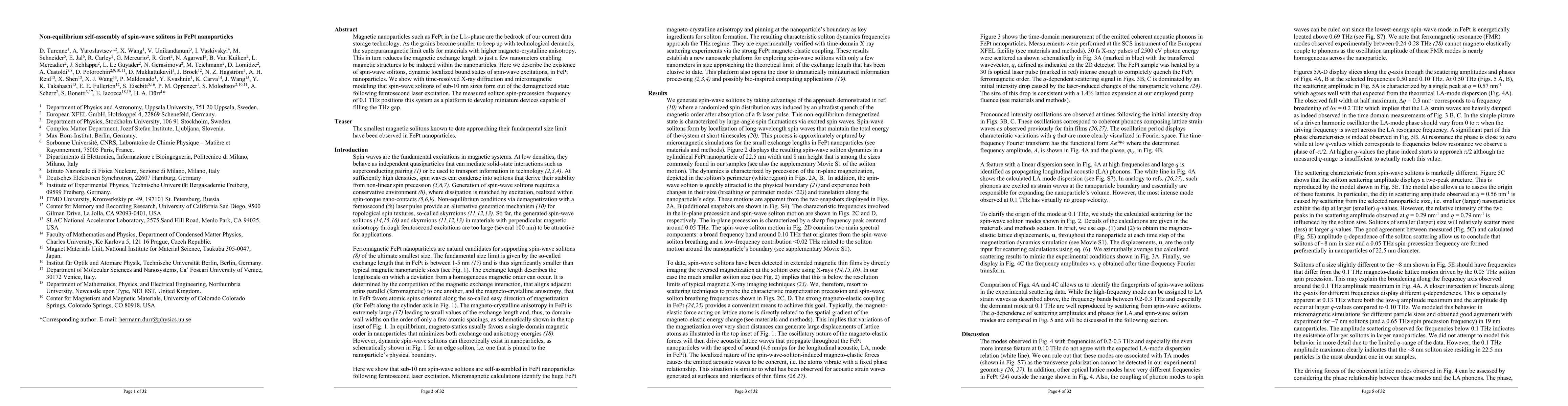 The paper reports on the formation of spin-wave solitons in FePt nanoparticles induced by femtosecond laser excitation, demonstrating a new method to create dynamic magnetic structures within superparamagnetic nanoparticles. These spin-wave solitons, identified via time-resolved X-ray diffraction and micromagnetic modeling, hold potential for developing miniaturized devices operating in the terahertz frequency range.