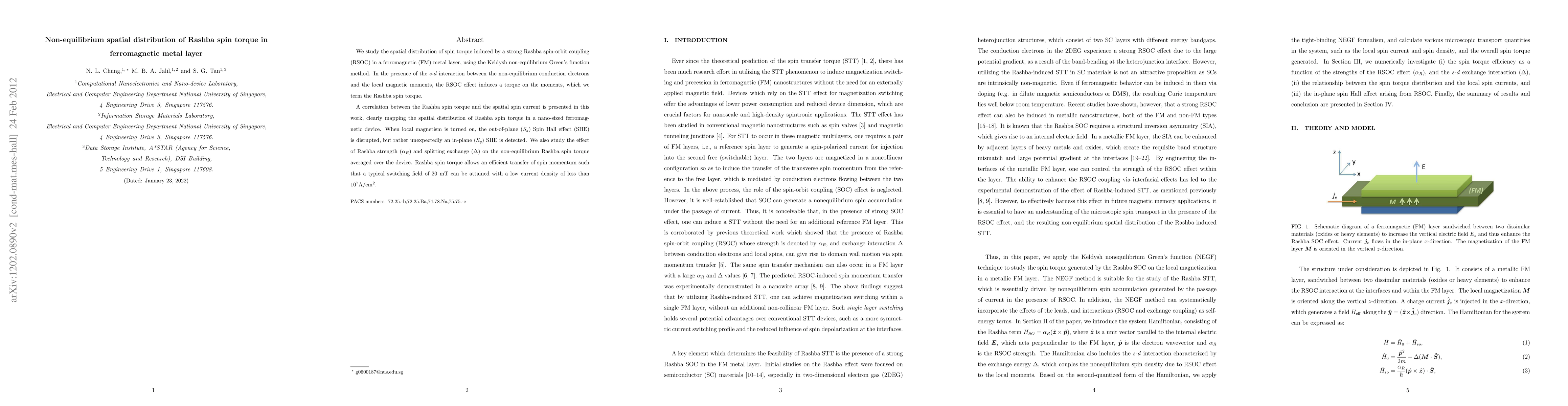 This paper investigates the spatial distribution of spin torque in a ferromagnetic metal layer induced by Rashba spin-orbit coupling using the Keldysh non-equilibrium Green's function method, revealing an in-plane Spin Hall effect when local magnetism is activated and demonstrating efficient spin momentum transfer with low current density.