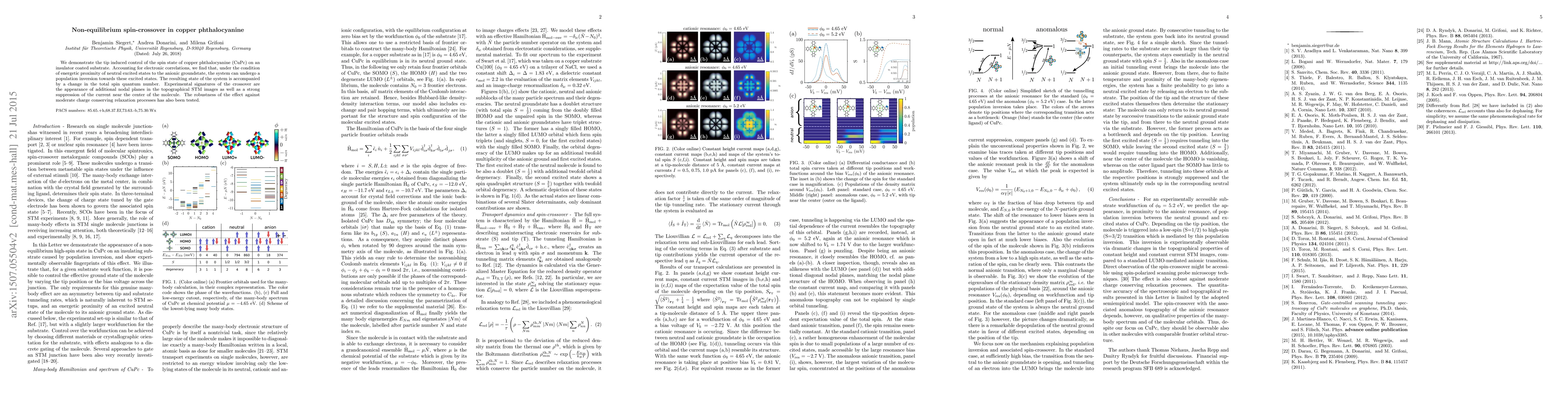 This paper demonstrates the tip-induced control of spin states in copper phthalocyanine on an insulator, revealing a non-equilibrium spin-crossover driven by the energetic proximity of neutral excited states to the anionic ground state. Experimental evidence includes changes in STM images and current suppression, highlighting the robustness of the effect.