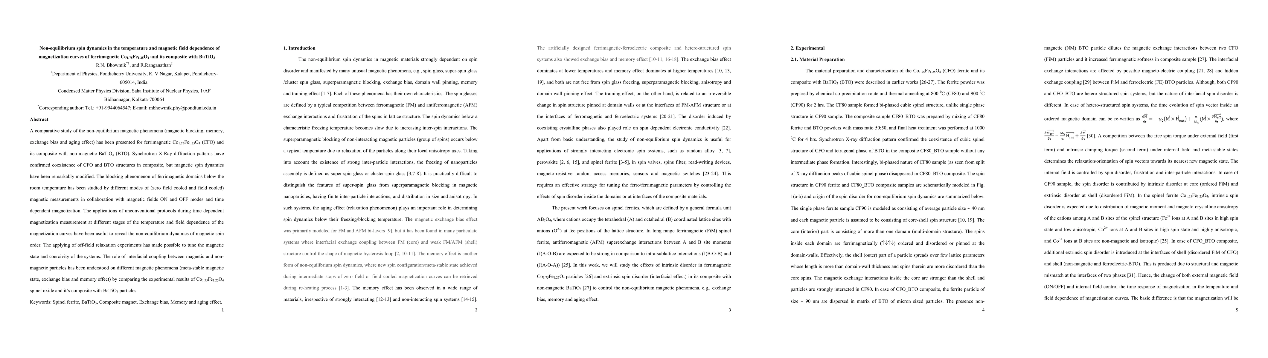 A comparative study of the non-equilibrium magnetic phenomena (magnetic blocking, memory, exchange bias and aging effect) has been presented for ferrimagnetic Co$_{1.75}$Fe$_{1.25}$O$_4$ (CFO) and its composite with non-magnetic BaTiO$_3$ (BTO). Synchrotron X-Ray diffraction patterns have confirmed coexistence of CFO and BTO structures in composite, but magnetic spin dynamics have been remarkably modified. The blocking phenomenon of ferrimagnetic domains below the room temperature has been studied by different modes of (zero field cooled and field cooled) magnetic measurements in collaboration with magnetic fields ON and OFF modes and time dependent magnetization. The applications of unconventional protocols during time dependent magnetization measurement at different stages of the temperature and field dependence of the magnetization curves have been useful to reveal the non-equilibrium dynamics of magnetic spin order. The applying of off-field relaxation experiments has made possible to tune the magnetic state and coercivity of the systems. The role of interfacial coupling between magnetic and non-magnetic particles has been understood on different magnetic phenomena (meta-stable magnetic state, exchange bias and memory effect) by comparing the experimental results of Co$_{1.75}$Fe$_{1.25}$O$_4$ spinel oxide and its composite with BaTiO$_3$ particles.