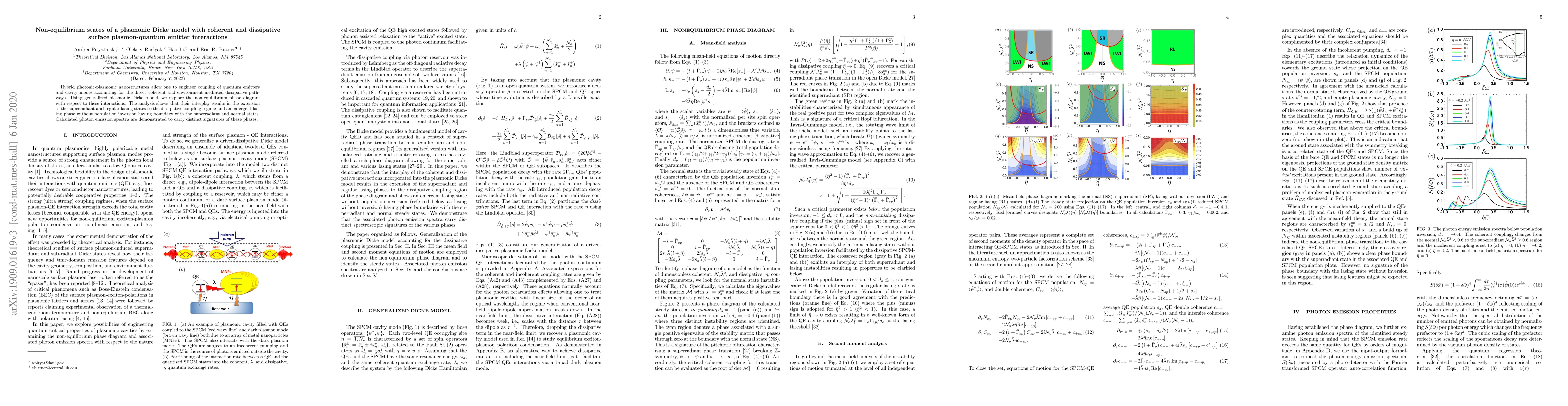 This paper investigates non-equilibrium states in a plasmonic Dicke model, revealing how coherent and dissipative interactions between quantum emitters and plasmonic modes extend superradiant and lasing states into the dissipative regime. The study uncovers an emergent lasing phase without population inversion, characterized by distinct photon emission signatures.