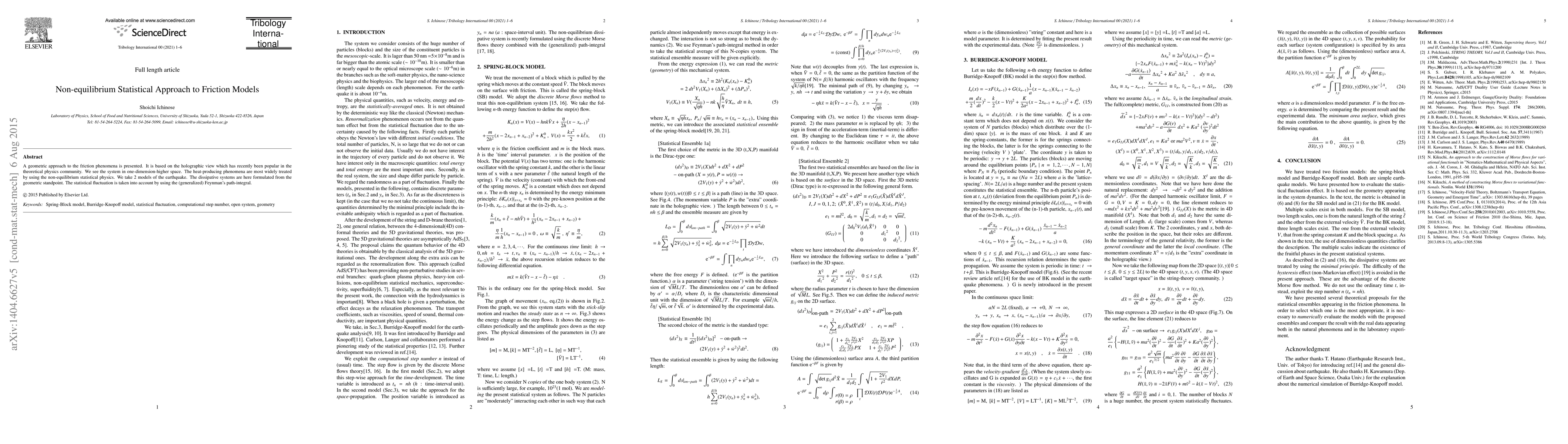 A geometric approach to the friction phenomena is presented. It is based on the holographic view which has recently been popular in the theoretical physics community. We see the system in one-dimension-higher space. The heat-producing phenomena are most widely treated by using the non-equilibrium statistical physics. We take 2 models of the earthquake. The dissipative systems are here formulated from the geometric standpoint. The statistical fluctuation is taken into account by using the (generalized) Feynman's path-integral.