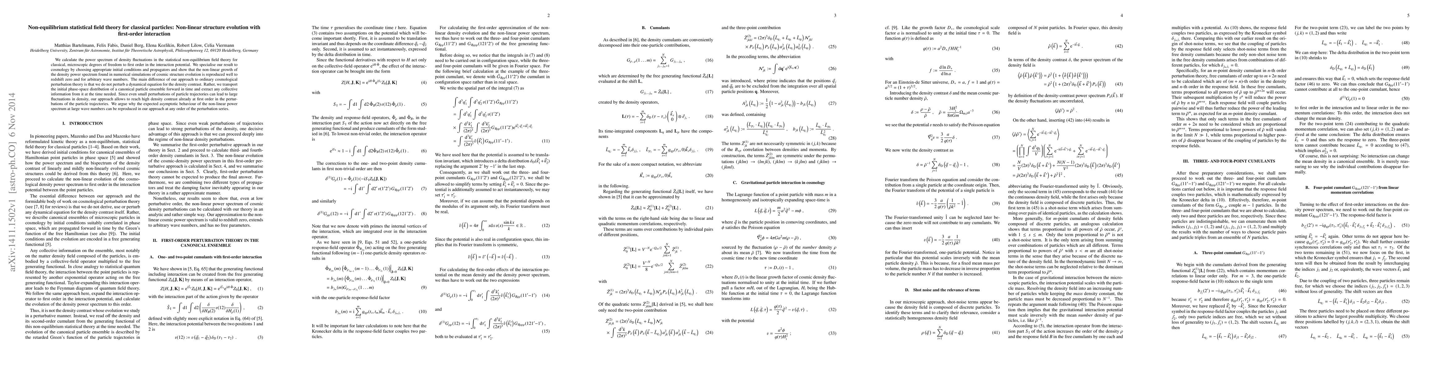 This paper develops a non-equilibrium statistical field theory for classical particles to first order in interaction potential, showing it accurately reproduces the non-linear growth of density power spectrum in cosmic structure evolution. Unlike traditional cosmological perturbation theory, it evolves the initial phase-space distribution of particles rather than perturbing a dynamical equation, allowing for high density contrast at first order.