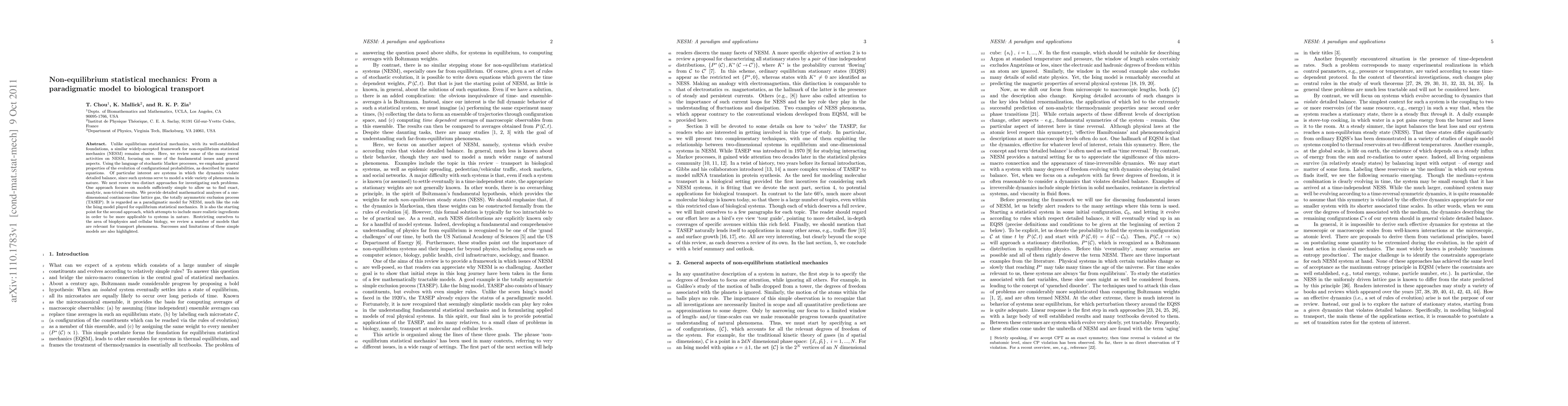 This paper reviews recent developments in non-equilibrium statistical mechanics (NESM), focusing on systems violating detailed balance, and uses stochastic Markov processes to analyze evolution. It examines the totally asymmetric exclusion process (TASEP) as a foundational model and explores its applications to biological transport phenomena in biophysics.