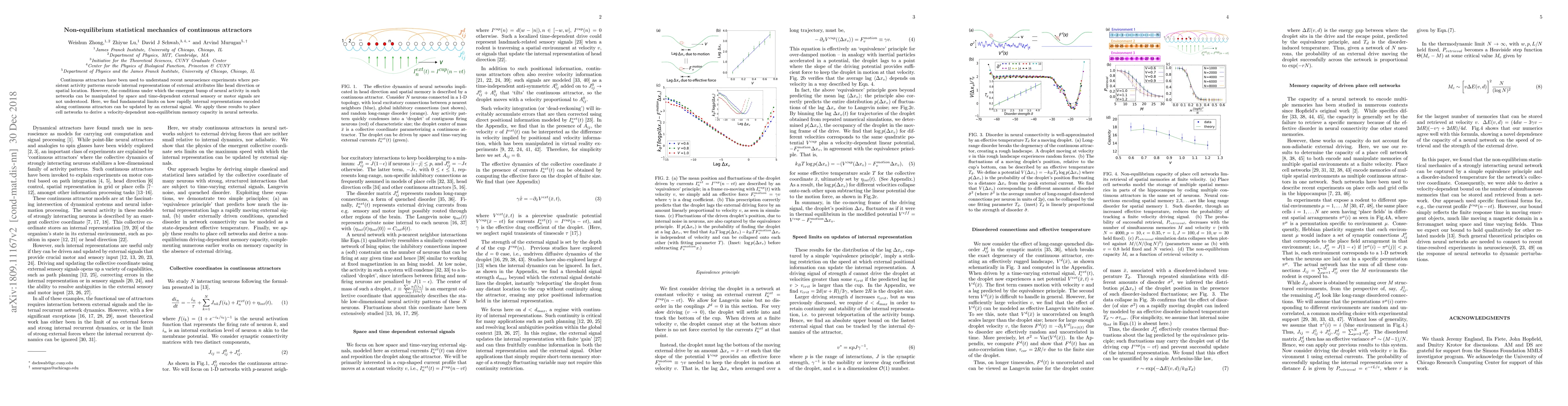 Continuous attractors have been used to understand recent neuroscience experiments where persistent activity patterns encode internal representations of external attributes like head direction or spatial location. However, the conditions under which the emergent bump of neural activity in such networks can be manipulated by space and time-dependent external sensory or motor signals are not understood. Here, we find fundamental limits on how rapidly internal representations encoded along continuous attractors can be updated by an external signal. We apply these results to place cell networks to derive a velocity-dependent non-equilibrium memory capacity in neural networks.