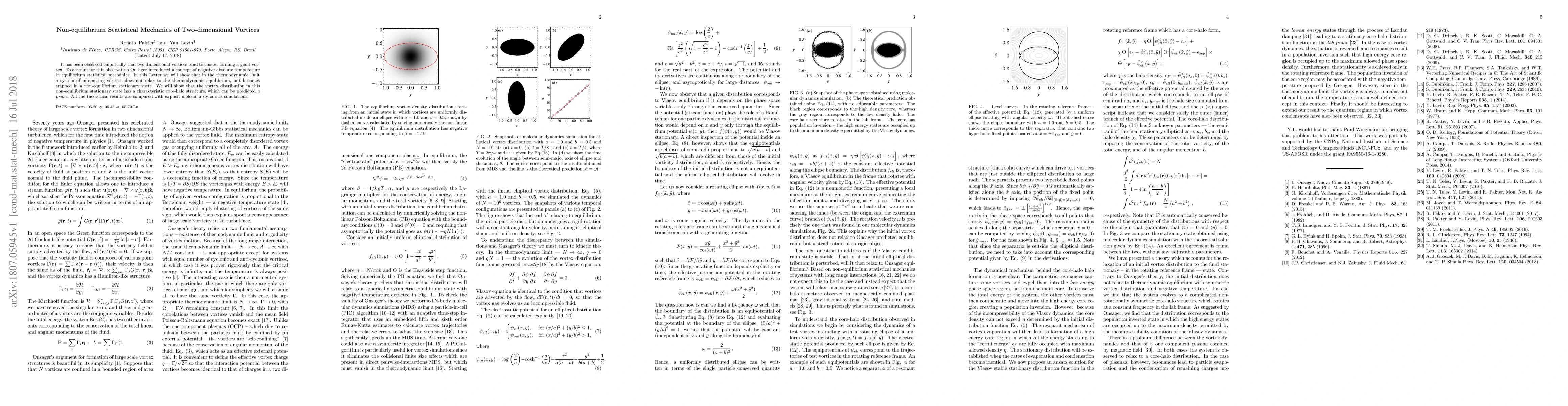 This paper explores the non-equilibrium statistical mechanics of two-dimensional vortices, demonstrating that they cluster into a giant vortex and do not reach thermodynamic equilibrium but instead settle into a predictable non-equilibrium stationary state with a core-halo structure, validated by molecular dynamics simulations.