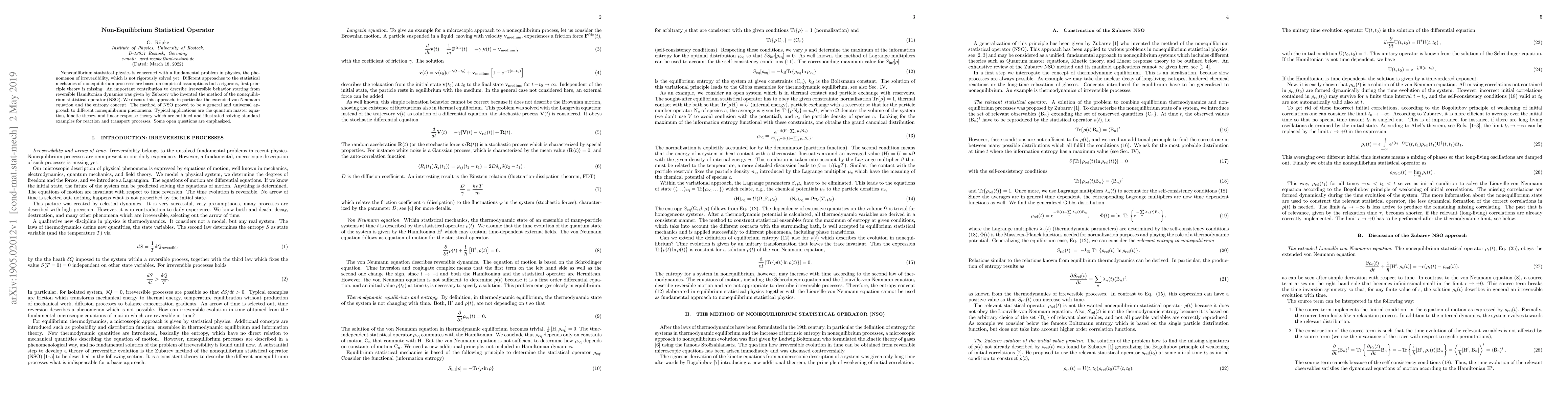 This paper explores the nonequilibrium statistical operator (NSO) method developed by Zubarev to describe irreversible processes in statistical physics, emphasizing its application to quantum master equations, kinetic theory, and linear response theory. It highlights the method's universality and outlines open questions in the field.