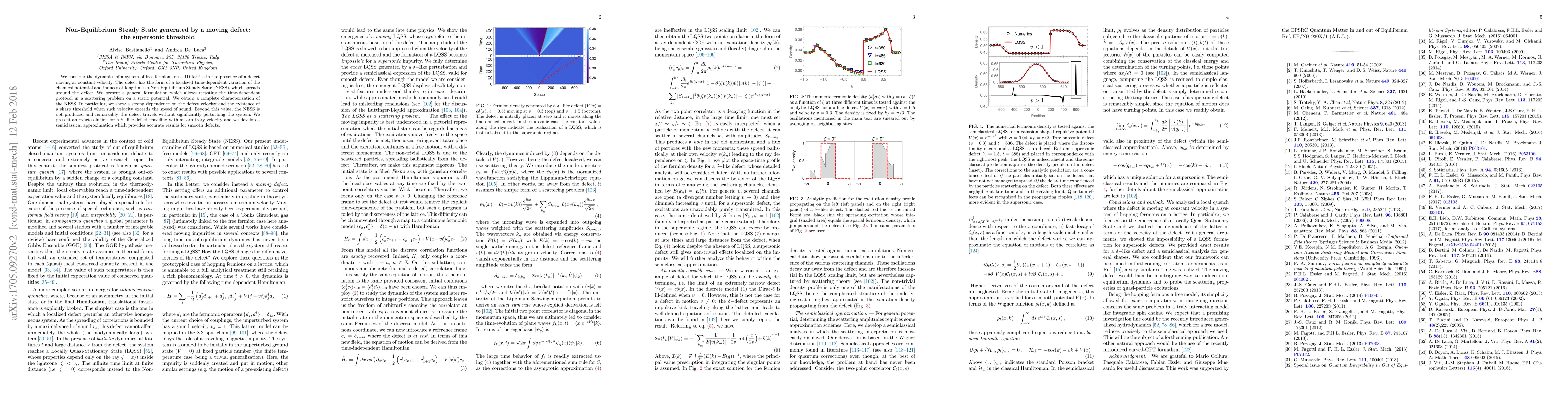 We consider the dynamics of a system of free fermions on a 1D lattice in the presence of a defect moving at constant velocity. The defect has the form of a localized time-dependent variation of the chemical potential and induces at long times a Non-Equilibrium Steady State (NESS), which spreads around the defect. We present a general formulation which allows recasting the time-dependent protocol in a scattering problem on a static potential. We obtain a complete characterization of the NESS. In particular, we show a strong dependence on the defect velocity and the existence of a sharp threshold when such velocity exceeds the speed of sound. Beyond this value, the NESS is not produced and remarkably the defect travels without significantly perturbing the system. We present an exact solution for a $\delta-$like defect traveling with an arbitrary velocity and we develop a semiclassical approximation which provides accurate results for smooth defects.
