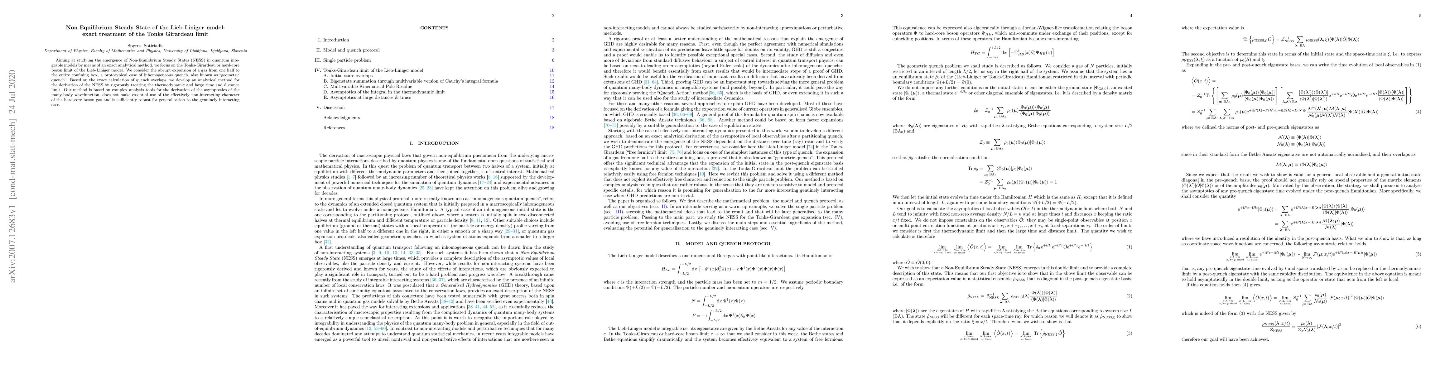 This paper develops an exact analytical method to study Non-Equilibrium Steady States (NESS) in the Tonks-Girardeau limit of the Lieb-Liniger model, focusing on the inhomogeneous quench scenario. The authors employ complex analysis to derive the NESS without relying on the non-interacting nature of the hard-core boson gas, and the method is robust for generalization to interacting systems.