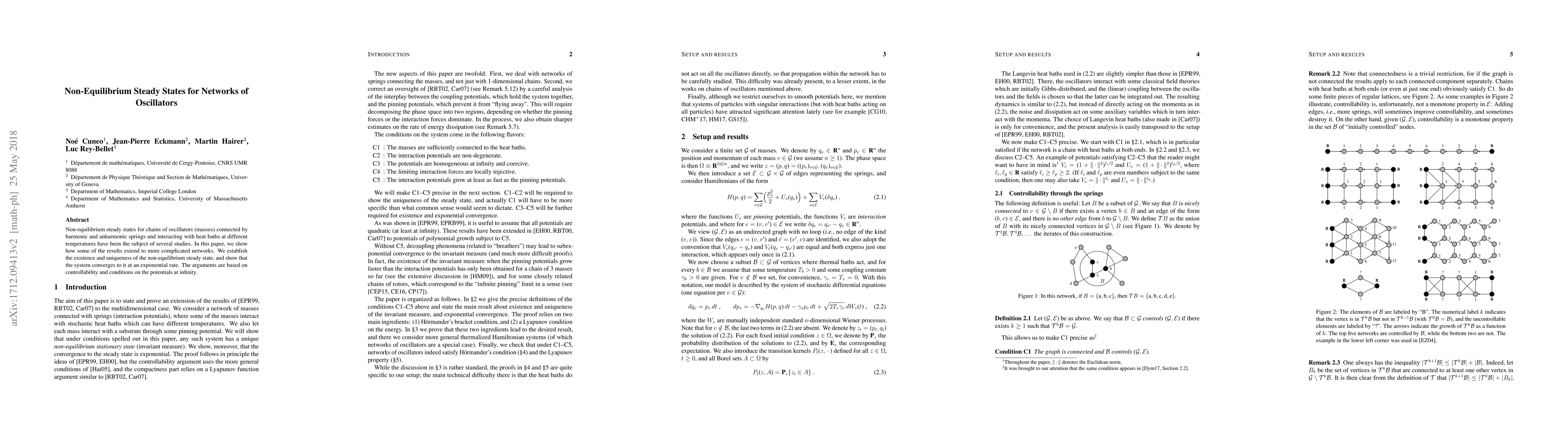 This paper investigates non-equilibrium steady states in complex networks of oscillators connected by springs and exposed to different heat baths, demonstrating the existence and uniqueness of such states, and proving their convergence to these states at an exponential rate through controllability and potential conditions.