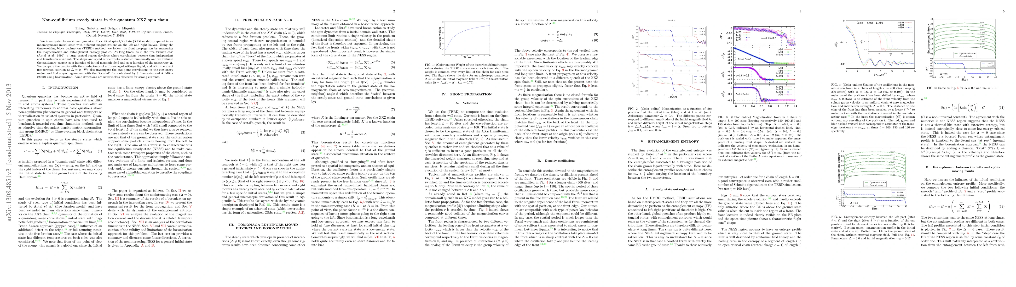 We investigate the dynamics of a critical XXZ spin-1/2 chain prepared in an inhomogeneous initial state with different magnetizations on the left and right halves. We simulate the real-time evolution using the time-evolving block decimation (TEBD) method. We follow the front propagation by measuring the magnetization and entanglement entropy profiles, and we focus on the situation where the initial state is not fully polarized. At long times, as in the free fermion case (T. Antal et al. 1999), a large central region develops where correlations become time-independent and translation invariant. The shape and speed of the fronts is studied numerically and we evaluate the stationary current as a function of initial magnetic field and as a function of the anisotropy \Delta. We compare the results with the conductance of a Tomonaga-Luttinger liquid, and with the exact free-fermion solution at \Delta=0. We also investigate the two-point correlations in the stationary region and find a good agreement with the "twisted" form obtained by J. Lancaster and A. Mitra (2010) using bosonization. Some deviations are nevertheless observed for strong currents.
