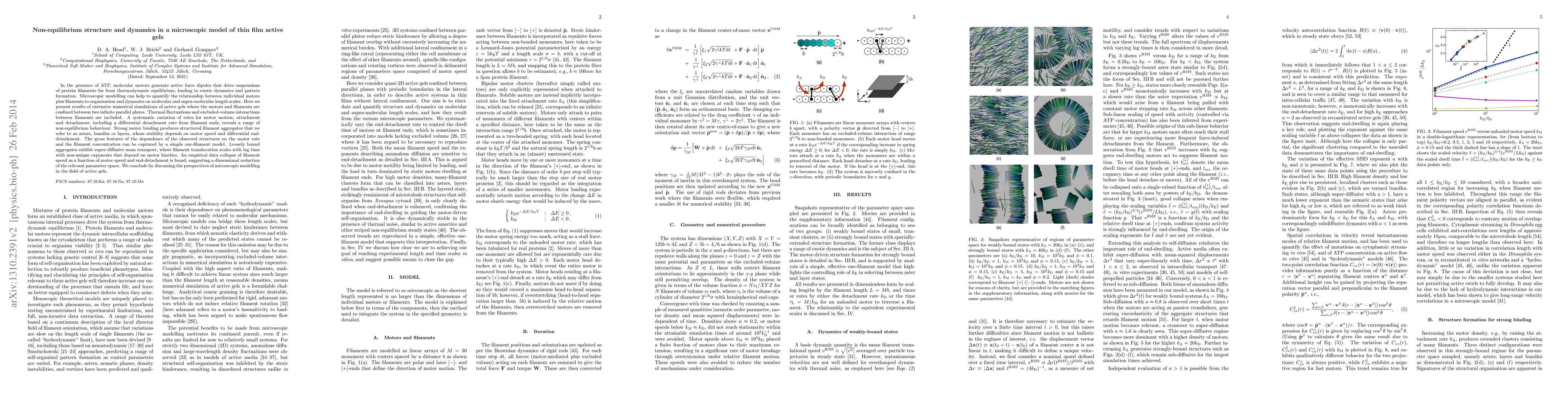 In the presence of ATP, molecular motors generate active force dipoles that drive suspensions of protein filaments far from thermodynamic equilibrium, leading to exotic dynamics and pattern formation. Microscopic modelling can help to quantify the relationship between individual motors plus filaments to organisation and dynamics on molecular and supra-molecular length scales. Here we present results of extensive numerical simulations of active gels where the motors and filaments are confined between two infinite parallel plates. Thermal fluctuations and excluded-volume interactions between filaments are included. A systematic variation of rates for motor motion, attachment and detachment, including a differential detachment rate from filament ends, reveals a range of non-equilibrium behaviour. Strong motor binding produces structured filament aggregates that we refer to as asters, bundles or layers, whose stability depends on motor speed and differential end-detachment. The gross features of the dependence of the observed structures on the motor rate and the filament concentration can be captured by a simple one-filament model. Loosely bound aggregates exhibit super-diffusive mass transport, where filament translocation scales with lag time with non-unique exponents that depend on motor kinetics. An empirical data collapse of filament speed as a function of motor speed and end-detachment is found, suggesting a dimensional reduction of the relevant parameter space. We conclude by discussing the perspectives of microscopic modelling in the field of active gels.