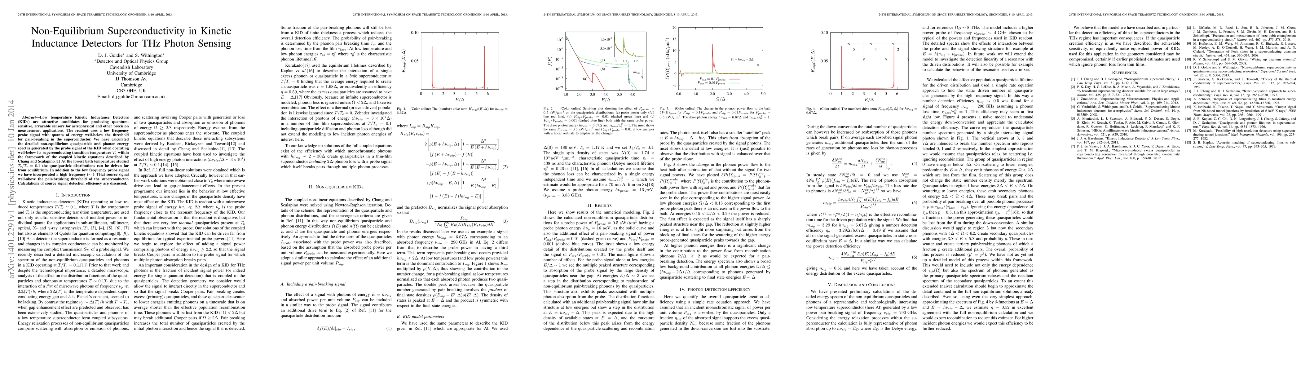 Low temperature Kinetic Inductance Detectors (KIDs) are attractive candidates for producing quantumsensitive, arrayable sensors for astrophysical and other precision measurement applications. The readout uses a low frequency probe signal with quanta of energy well-below the threshold for pair-breaking in the superconductor. We have calculated the detailed non-equilibrium quasiparticle and phonon energy spectra generated by the probe signal of the KID when operating well-below its superconducting transition temperature Tc within the framework of the coupled kinetic equations described by Chang and Scalapino.[1] At the lowest bath temperature studied Tb/Tc = 0.1 the quasiparticle distributions can be driven far from equilibrium. In addition to the low frequency probe signal we have incorporated a high frequency (~ 1 THz) source signal well-above the pair-breaking threshold of the superconductor. Calculations of source signal detection efficiency are discussed