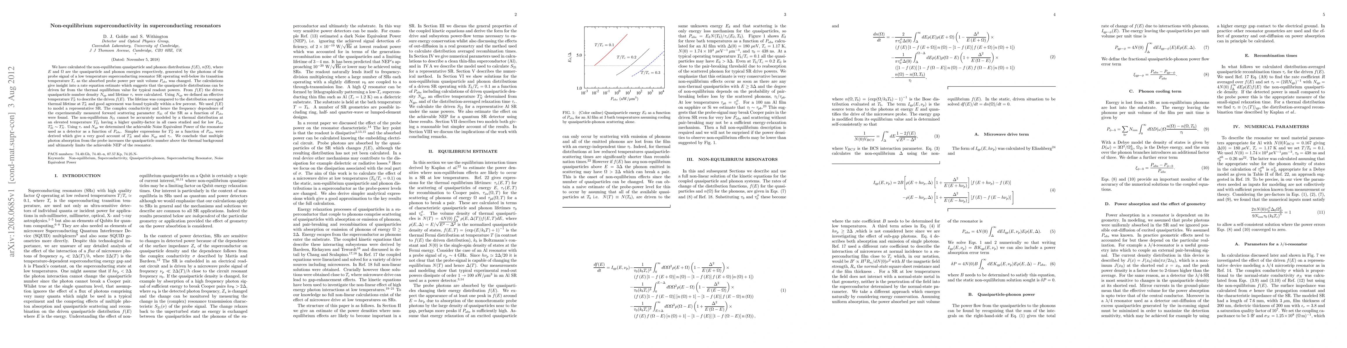 We have calculated the non-equilibrium quasiparticle and phonon distributions $f(E)$, $n(\Omega)$, where $E$ and $\Omega$ are the quasiparticle and phonon energies respectively, generated by the photons of the probe signal of a low temperature superconducting resonator SR operating well-below its transition temperature $T_c$ as the absorbed probe power per unit volume $P_{abs}$ was changed. The calculations give insight into a rate equation estimate which suggests that the quasiparticle distributions can be driven far from the thermal equilibrium value for typical readout powers. From $f(E)$ the driven quasiparticle number density $N_{qp}$ and lifetime $\tau_r$ were calculated. Using $N_{qp}$ we defined an effective temperature $T_N^*$ to describe the driven $f(E)$. The lifetime was compared to the distribution averaged thermal lifetime at $T_N^*$ and good agreement was found typically within a few percent. We used $f(E)$ to model a representative SR. The complex conductivity and hence the frequency dependence of the experimentally measured forward scattering parameter $S_{21}$ of the SR as a function of $P_{abs}$ were found. The non-equilibrium $S_{21}$ cannot be accurately modeled by a thermal distribution at an elevated temperature $T_{21}^*$ having a higher quality-factor in all cases studied and for low $P_{abs}$ $T_{21}^*\sim T_N^*$. Using $\tau_r$ and $N_{qp}$ we determined the achievable Noise Equivalent Power of the resonator used as a detector as a function of $P_{abs}$. Simpler expressions for $T_N^*$ as a function of $P_{abs}$ were derived which give a very good account of $T_N^*$ and also $N_{qp}$ and $\tau_r$. We conclude that multiple photon absorption from the probe increases the quasiparticle number above the thermal background and ultimately limits the achievable NEP of the resonator.