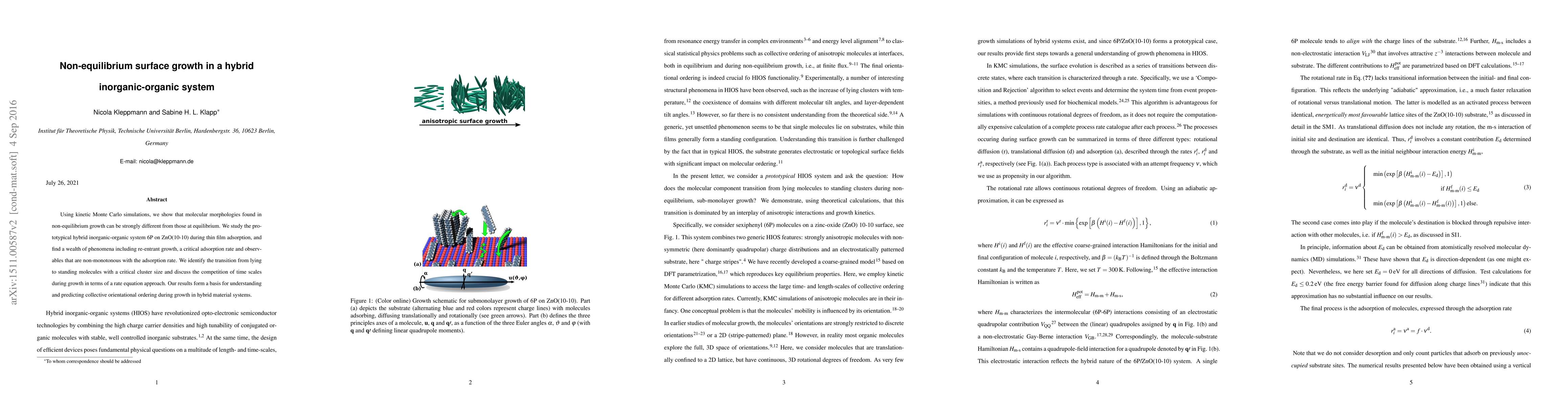 This study uses kinetic Monte Carlo simulations to explore non-equilibrium growth in a hybrid inorganic-organic system, revealing diverse molecular morphologies and phenomena such as re-entrant growth and critical adsorption rates. The findings provide insights into the transition dynamics and collective orientational ordering in such systems.