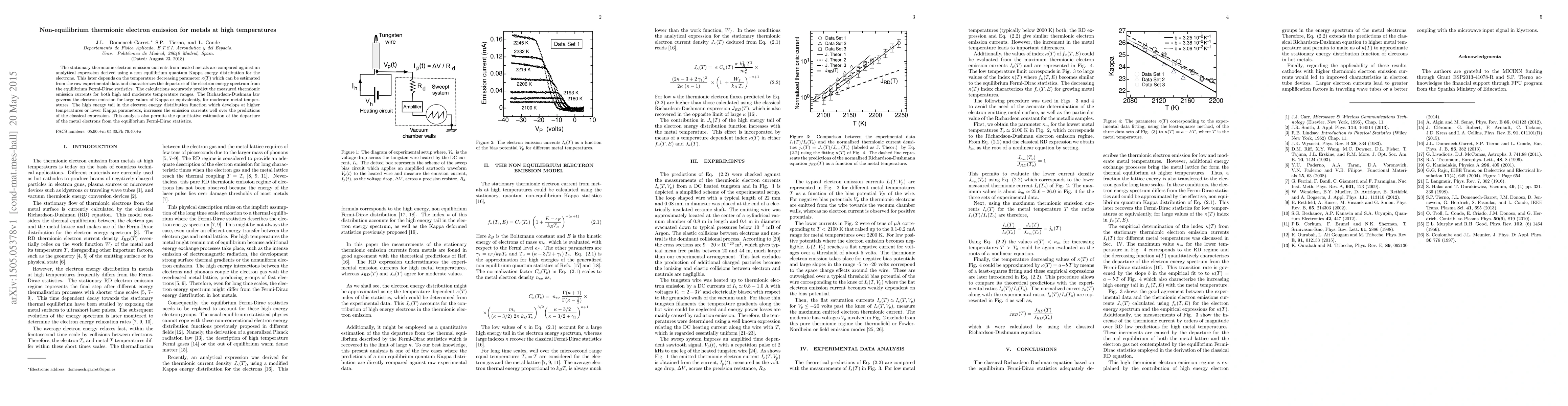 This paper compares stationary thermionic electron emission currents from heated metals with an analytical model based on a non-equilibrium quantum Kappa energy distribution. The model accurately predicts measured currents across high and moderate temperature ranges, highlighting the increased emission currents due to the high-energy tail at higher temperatures.