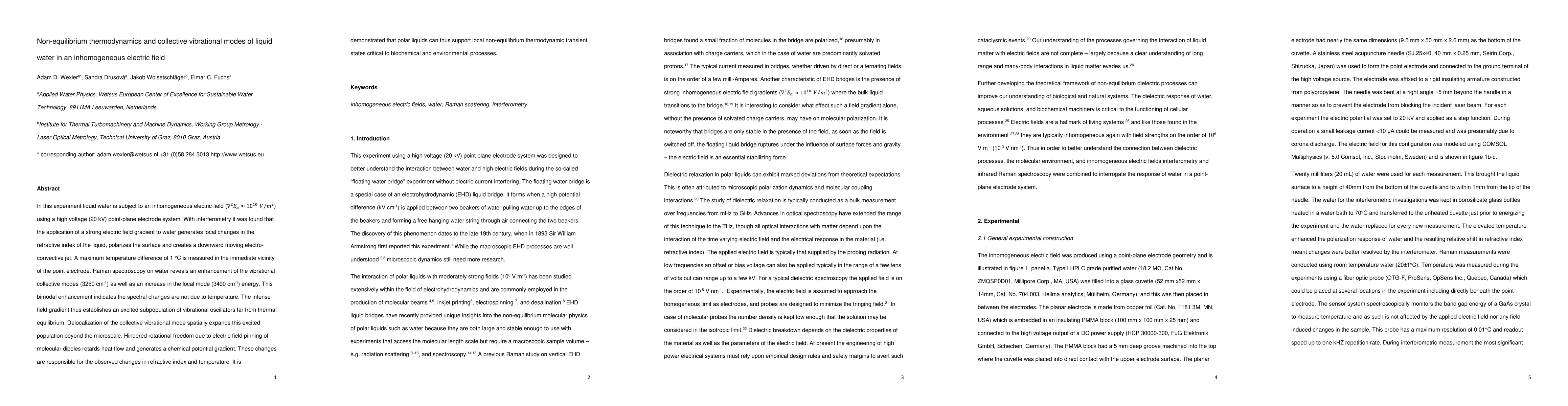 In this experiment liquid water is subject to an inhomogeneous electric field (${\nabla}^2 E_a {\approx} 10^{10} \frac{V}{m^2}$ ) using a high voltage (20 kV) point-plane electrode system. With interferometry it was found that the application of a strong electric field gradient to water generates local changes in the refractive index of the liquid, polarizes the surface and creates a downward moving electro-convective jet. A maximum temperature difference of 1 {\deg}C is measured in the immediate vicinity of the point electrode. Raman spectroscopy on water reveals an enhancement of the vibrational collective modes (3250 $cm^{-1}$) as well as an increase in the local mode (3490 $cm^{-1}$) energy. This bimodal enhancement indicates the spectral changes are not due to temperature. The intense field gradient thus establishes an excited subpopulation of vibrational oscillators far from thermal equilibrium. Delocalization of the collective vibrational mode spatially expands this excited population beyond the microscale. Hindered rotational freedom due to electric field pinning of molecular dipoles retards heat flow and generates a chemical potential gradient. These changes are responsible for the observed changes in refractive index and temperature. It is demonstrated that polar liquids can thus support local non-equilibrium thermodynamic transient states critical to biochemical and environmental processes.