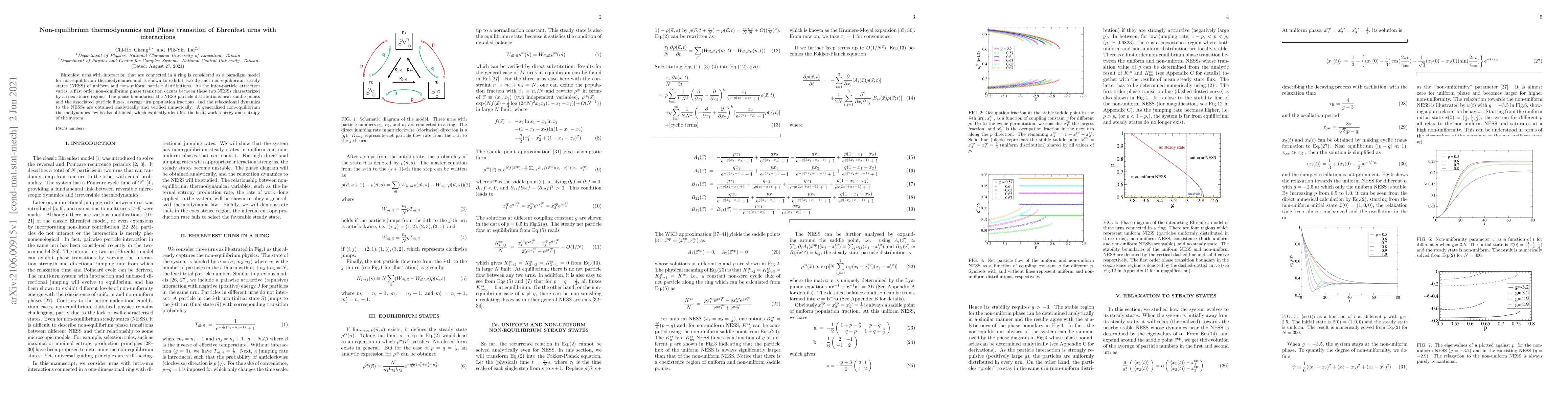 This paper investigates the non-equilibrium thermodynamics of interacting Ehrenfest urns arranged in a ring, revealing two distinct non-equilibrium steady states and a first-order phase transition between them. Analytical and numerical results detail the phase boundaries, particle distributions, and relaxational dynamics.