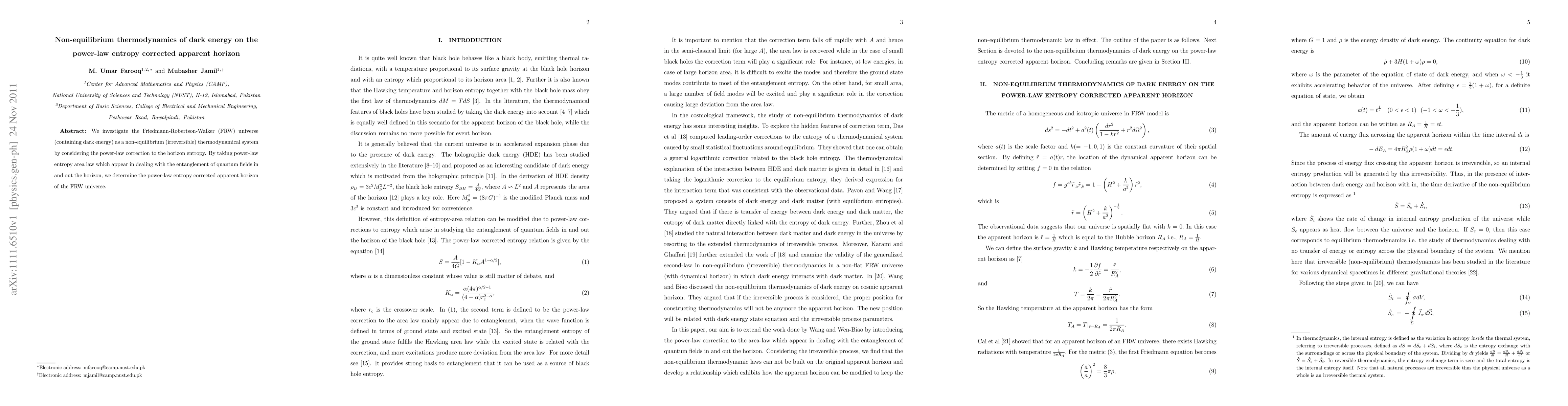 This paper explores the non-equilibrium thermodynamics of a dark energy-containing Friedmann-Robertson-Walker (FRW) universe, focusing on the power-law correction to the horizon entropy and determining the corrected apparent horizon.