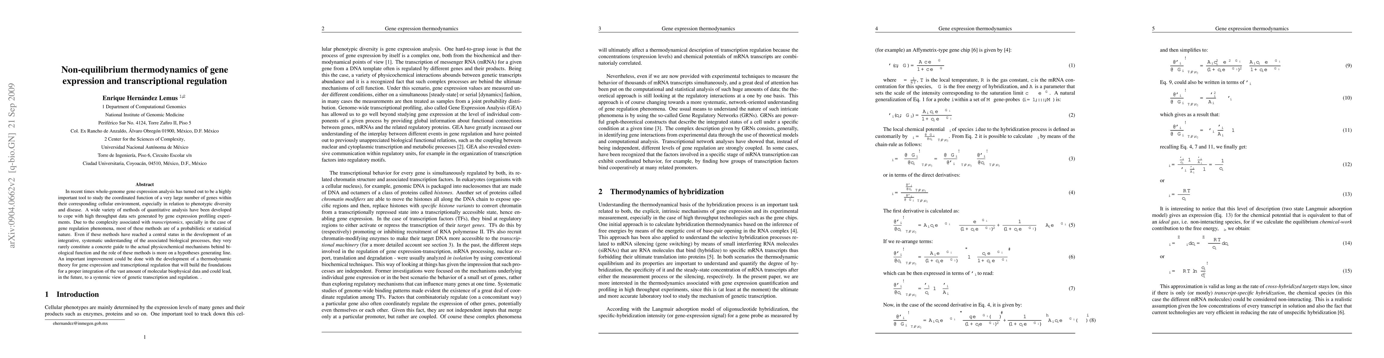 In recent times whole-genome gene expression analysis has turned out to be a highly important tool to study the coordinated function of a very large number of genes within their corresponding cellular environment, especially in relation to phenotypic diversity and disease. A wide variety of methods of quantitative analysis have been developed to cope with high throughput data sets generated by gene expression profiling experiments. Due to the complexity associated with transcriptomics, specially in the case of gene regulation phenomena, most of these methods are of a probabilistic or statistical nature. Even if these methods have reached a central status in the development of an integrative, systematic understanding of the associated biological processes, they very rarely constitute a concrete guide to the actual physicochemical mechanisms behind biological function and the role of these methods is more on a hypotheses generating line. An important improvement could be done with the development of a thermodynamic theory for gene expression and transcriptional regulation that will build the foundations for a proper integration of the vast amount of molecular biophysical data and could lead, in the future, to a systemic view of genetic transcription and regulation.