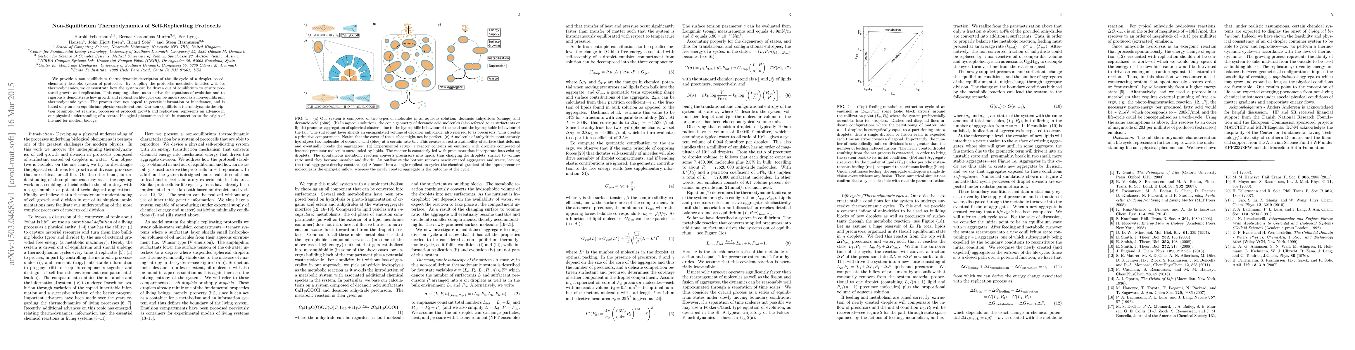 We provide a non-equilibrium thermodynamic description of the life-cycle of a droplet based, chemically feasible, system of protocells. By coupling the protocells metabolic kinetics with its thermodynamics, we demonstrate how the system can be driven out of equilibrium to ensure protocell growth and replication. This coupling allows us to derive the equations of evolution and to rigorously demonstrate how growth and replication life-cycle can be understood as a non-equilibrium thermodynamic cycle. The process does not appeal to genetic information or inheritance, and is based only on non-equilibrium physics considerations. Our non-equilibrium thermodynamic description of simple, yet realistic, processes of protocell growth and replication, represents an advance in our physical understanding of a central biological phenomenon both in connection to the origin of life and for modern biology.