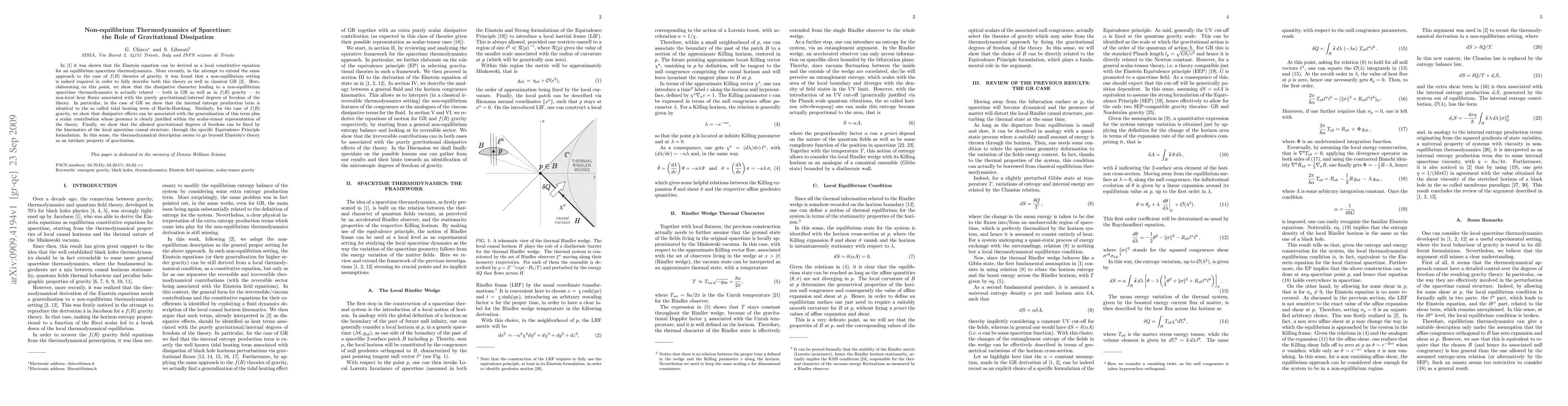 In arXiv:gr-qc/9504004 it was shown that the Einstein equation can be derived as a local constitutive equation for an equilibrium spacetime thermodynamics. More recently, in the attempt to extend the same approach to the case of $f(R)$ theories of gravity, it was found that a non-equilibrium setting is indeed required in order to fully describe both this theory as well as classical GR (arXiv:gr-qc/0602001). Here, elaborating on this point, we show that the dissipative character leading to a non-equilibrium spacetime thermodynamics is actually related -- both in GR as well as in $f(R)$ gravity -- to non-local heat fluxes associated with the purely gravitational/internal degrees of freedom of the theory. In particular, in the case of GR we show that the internal entropy production term is identical to the so called tidal heating term of Hartle-Hawking. Similarly, for the case of $f(R)$ gravity, we show that dissipative effects can be associated with the generalization of this term plus a scalar contribution whose presence is clearly justified within the scalar-tensor representation of the theory. Finally, we show that the allowed gravitational degrees of freedom can be fixed by the kinematics of the local spacetime causal structure, through the specific Equivalence Principle formulation. In this sense, the thermodynamical description seems to go beyond Einstein's theory as an intrinsic property of gravitation.