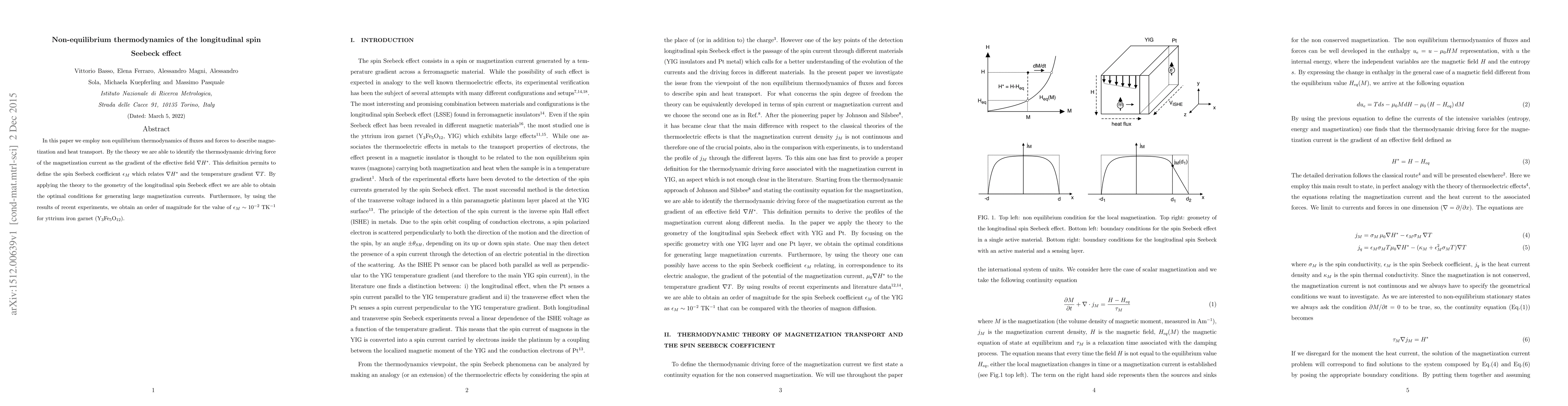 This paper employs non-equilibrium thermodynamics to describe magnetization and heat transport, identifying the effective field gradient $\nabla H^*$ as the driving force for magnetization current. It defines the spin Seebeck coefficient $\epsilon_M$ relating $\nabla H^*$ to temperature gradients, and finds optimal conditions for generating large magnetization currents, estimating $\epsilon_M \sim 10^{-2}$ TK$^{-1}$ for yttrium iron garnet.