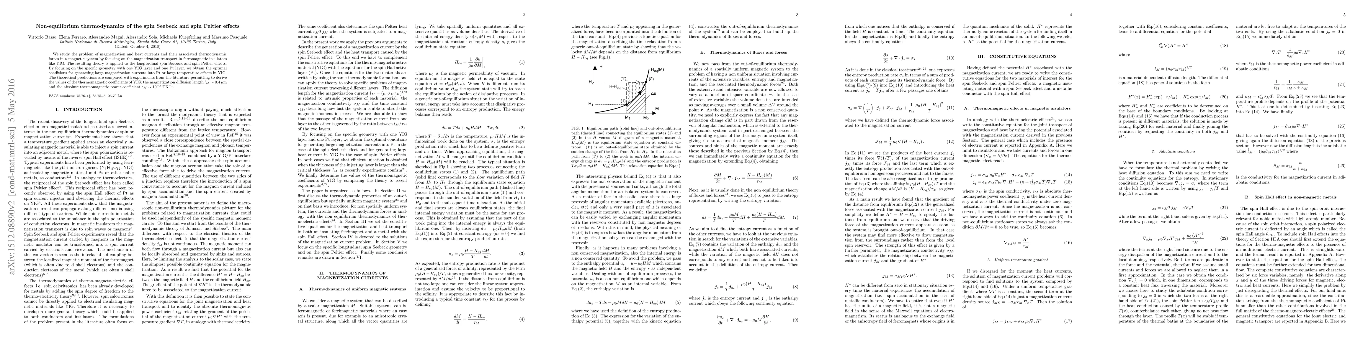 We study the problem of magnetization and heat currents and their associated thermodynamic forces in a magnetic system by focusing on the magnetization transport in ferromagnetic insulators like YIG. The resulting theory is applied to the longitudinal spin Seebeck and the spin Peltier effects. By focusing on the specific geometry with one YIG layer and one Pt layer, we obtain the optimal conditions for generating large magnetization currents into Pt or large temperature effects in YIG. The theoretical predictions are compared with experiments from the literature permitting to derive the values of the thermomagnetic coefficients of YIG: the magnetization diffusion length $l_M \sim 0.4 \, \mu$m and the absolute thermomagnetic power coefficient $\epsilon_M \sim 10^{-2}$ TK$^{-1}$.