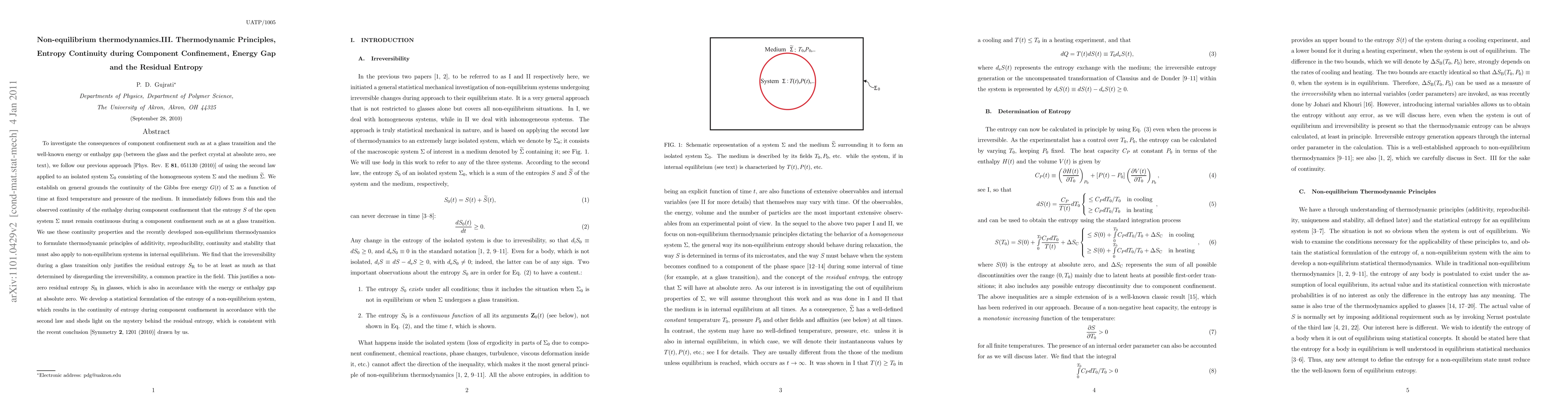 This paper explores the thermodynamic principles during component confinement, such as at a glass transition, establishing the continuity of Gibbs free energy and entropy. It justifies the presence of residual entropy in glasses, aligning with the energy gap observed at absolute zero, and provides a statistical formulation for the entropy of non-equilibrium systems.