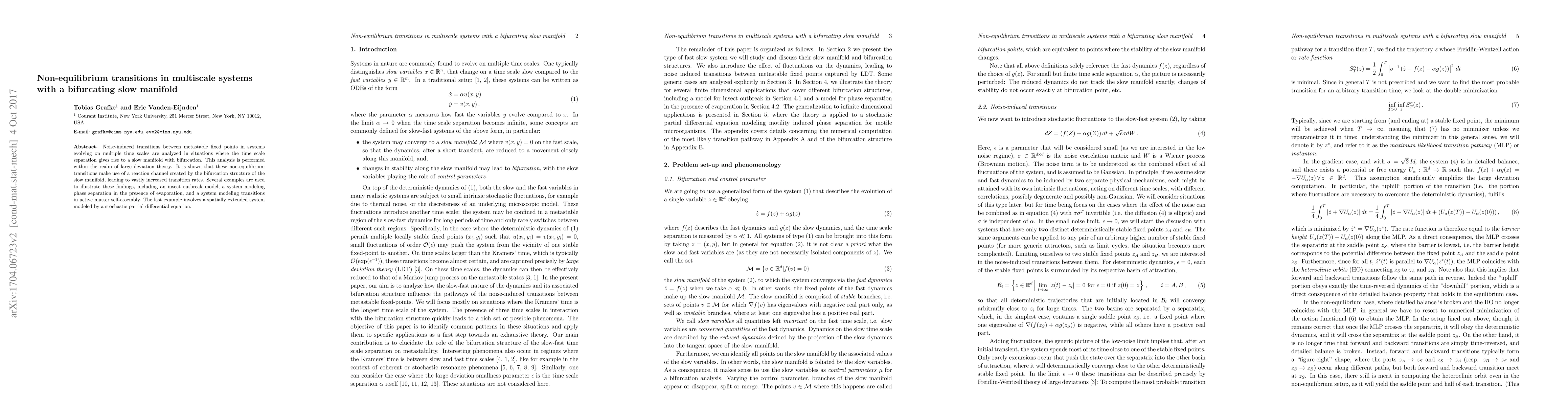 This paper analyzes how noise can trigger rapid transitions between stable states in complex systems with multiple time scales, using a mathematical framework that reveals the role of a 'slow manifold' in these transitions.