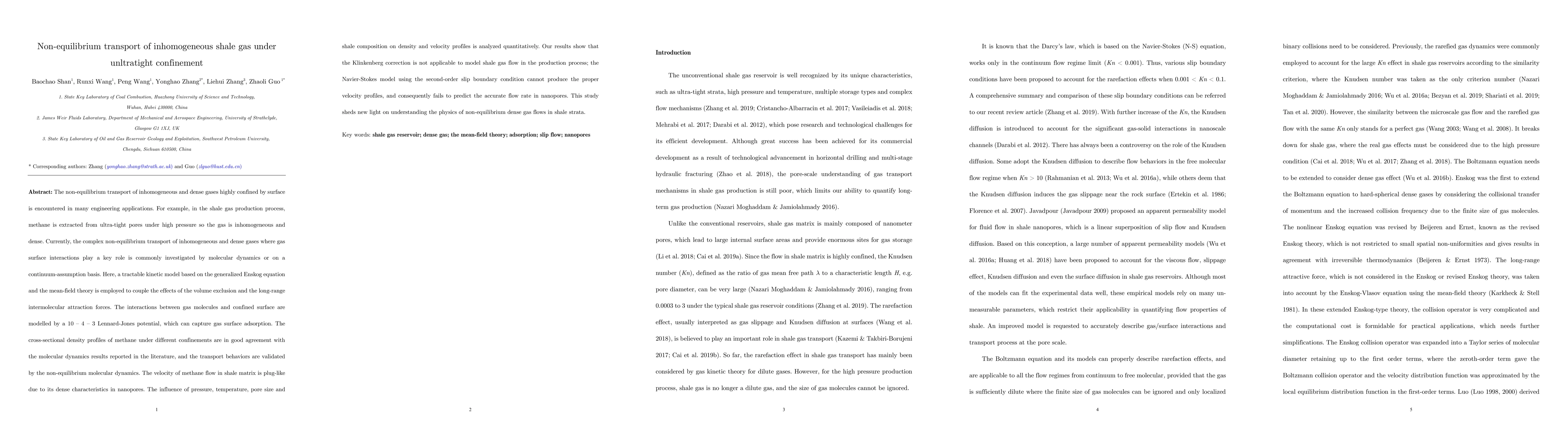 The non-equilibrium transport of inhomogeneous and dense gases highly confined by surface is encountered in many engineering applications. For example, in the shale gas production process, methane is extracted from ultra-tight pores under high pressure so the gas is inhomogeneous and dense. Currently, the complex non-equilibrium transport of inhomogeneous and dense gases where gas surface interactions play a key role is commonly investigated by molecular dynamics or on a continuum-assumption basis. Here, a tractable kinetic model based on the generalized Enskog equation and the mean-field theory is employed to couple the effects of the volume exclusion and the long-range intermolecular attraction forces. The interactions between gas molecules and confined surface are modelled by a 10-4-3 Lennard-Jones potential, which can capture gas surface adsorption. The cross-sectional density profiles of methane under different confinements are in good agreement with the molecular dynamics results reported in the literature, and the transport behaviors are validated by the non-equilibrium molecular dynamics. The velocity of methane flow in shale matrix is plug-like due to its dense characteristics in nanopores. The influence of pressure, temperature, pore size and shale composition on density and velocity profiles is analyzed quantitatively. Our results show that the Klinkenberg correction is not applicable to model shale gas flow in the production process; the Navier-Stokes model using the second-order slip boundary condition cannot produce the proper velocity profiles, and consequently fails to predict the accurate flow rate in nanopores. This study sheds new light on understanding the physics of non-equilibrium dense gas flows in shale strata.