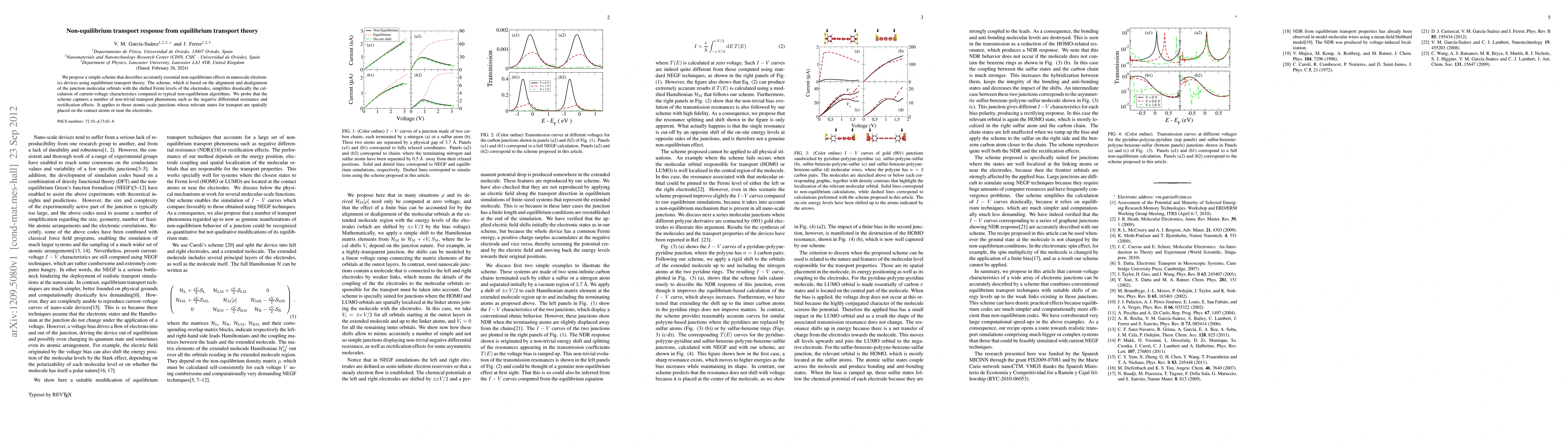 This paper introduces a simplified method for calculating non-equilibrium transport in nanoscale electronics using equilibrium transport theory, based on the alignment of molecular orbitals with shifted Fermi levels. The method accurately captures phenomena like negative differential resistance and rectification and is applicable to atomic-scale junctions.