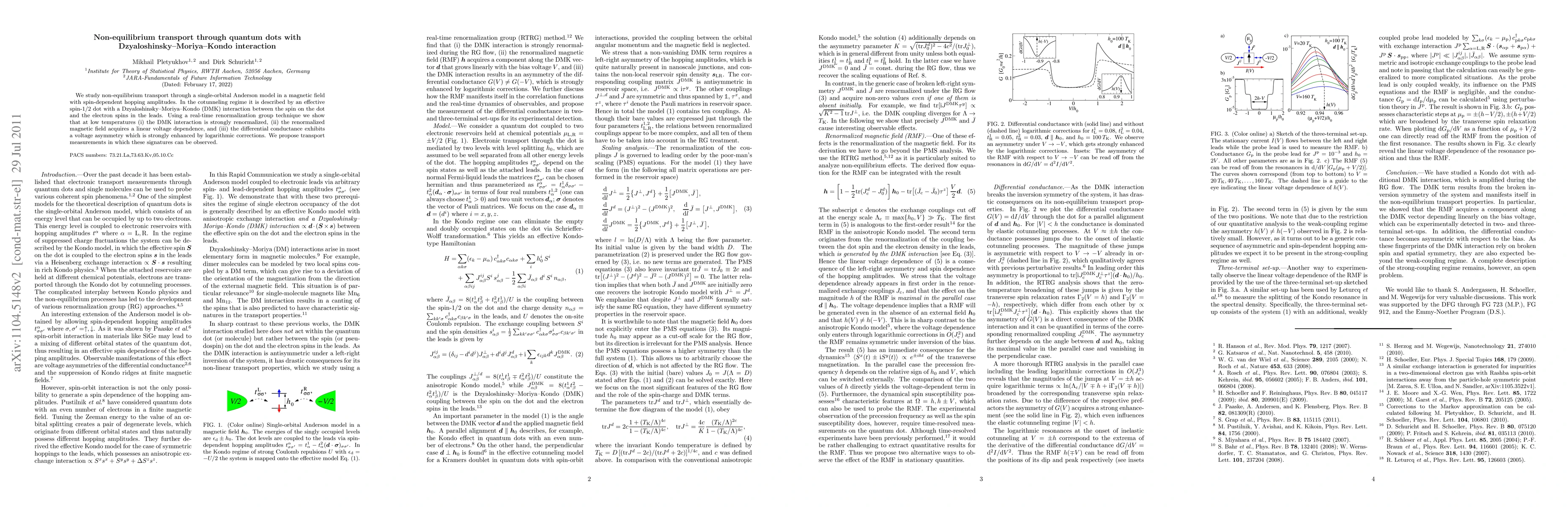 This paper investigates non-equilibrium transport through a quantum dot with Dzyaloshinsky-Moriya-Kondo interaction under a magnetic field, revealing strong renormalization of the interaction, a linear voltage dependence of the renormalized magnetic field, and a voltage-asymmetric differential conductance enhanced by logarithmic corrections. Proposed transport measurements aim to observe these effects.