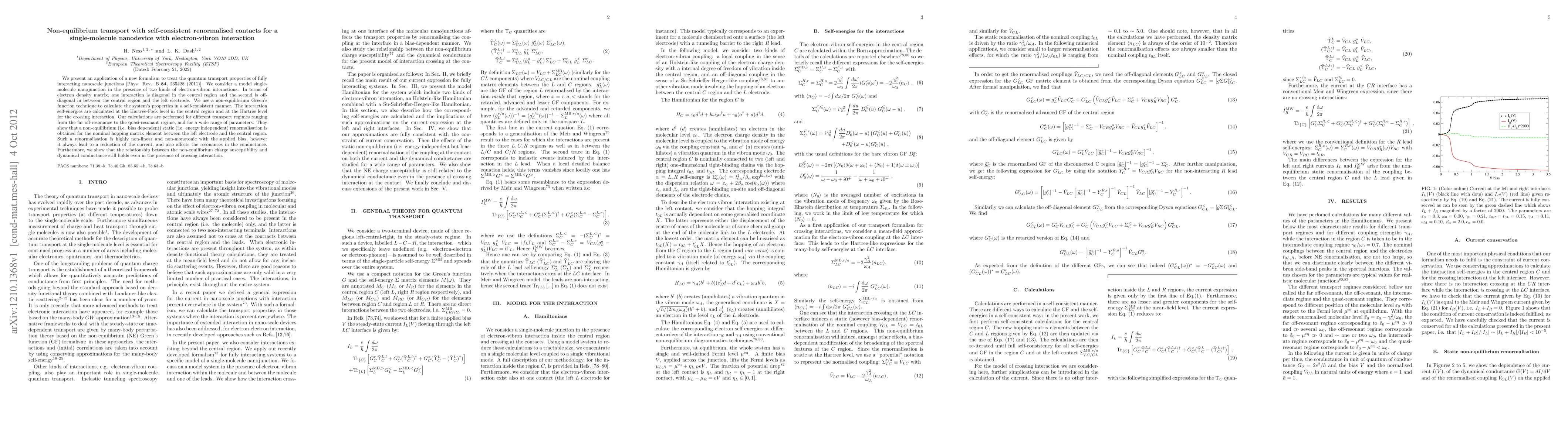 We present an application of a new formalism to treat the quantum transport properties of fully interacting nanoscale junctions [Phys. Rev. B {\bf 84}, 235428 (2011)]. We consider a model single-molecule nanojunction in the presence of two kinds of electron-vibron interactions. In terms of electron density matrix, one interaction is diagonal in the central region and the second is off-diagonal in between the central region and the left electrode. We use a non-equilibrium Green's function technique to calculate the system's properties in a self-consistent manner. The interaction self-energies are calculated at the Hartree-Fock level in the central region and at the Hartree level for the crossing interaction. Our calculations are performed for different transport regimes ranging from the far off-resonance to the quasi-resonant regime, and for a wide range of parameters. They show that a non-equilibrium (i.e. bias dependent) static (i.e. energy independent) renormalisation is obtained for the nominal hopping matrix element between the left electrode and the central region. Such a renormalisation is highly non-linear and non-monotonic with the applied bias, however it always lead to a reduction of the current, and also affects the resonances in the conductance. Furthermore, we show that the relationship between the non-equilibrium charge susceptibility and dynamical conductance still holds even in the presence of crossing interaction.