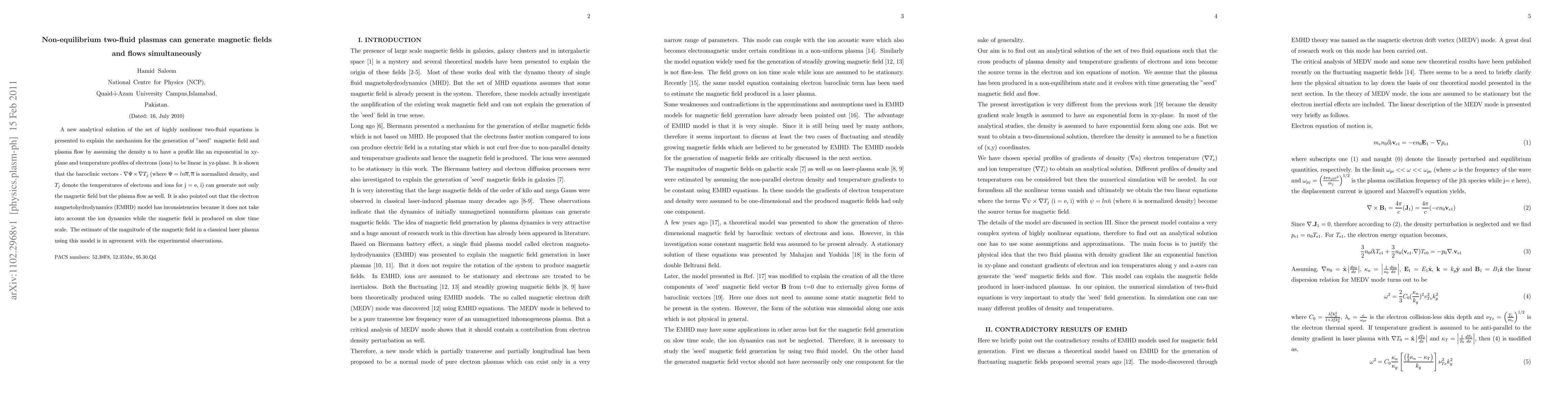 Researchers discovered that non-equilibrium two-fluid plasmas can generate both magnetic fields and plasma flows simultaneously using a new analytical solution to the two-fluid equations. This finding has implications for our understanding of plasma dynamics and has been confirmed by experimental observations in a classical laser plasma.