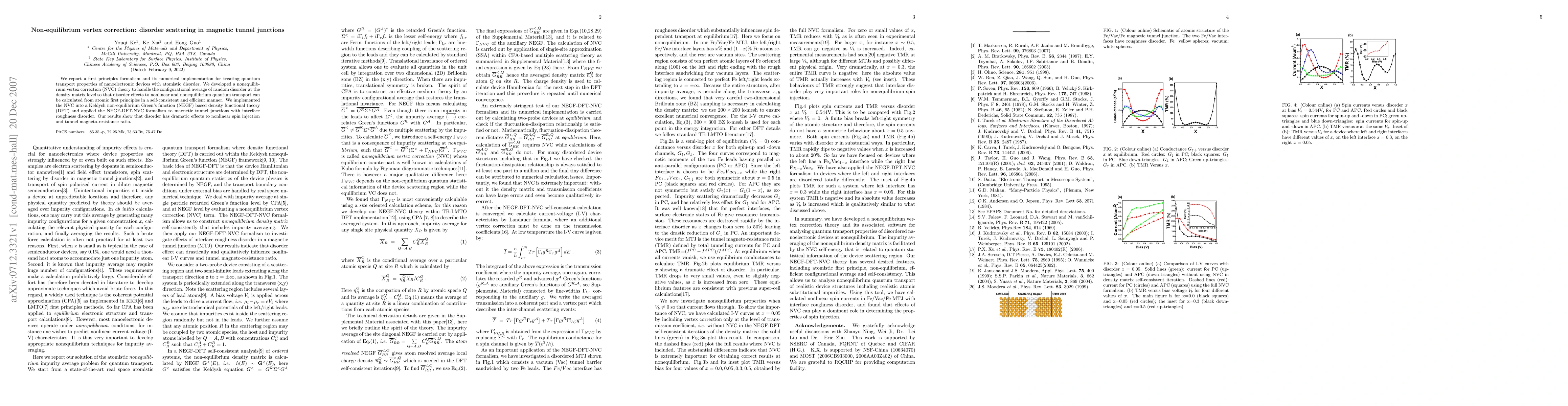 This paper introduces a first principles formalism for quantum transport in nanoelectronic devices with atomic disorder, employing a nonequilibrium vertex correction (NVC) theory within a Keldysh NEGF-DFT framework. The NVC method enables efficient calculation of disorder effects on nonlinear and nonequilibrium transport, revealing significant impacts on spin injection and tunnel magneto-resistance in magnetic tunnel junctions.