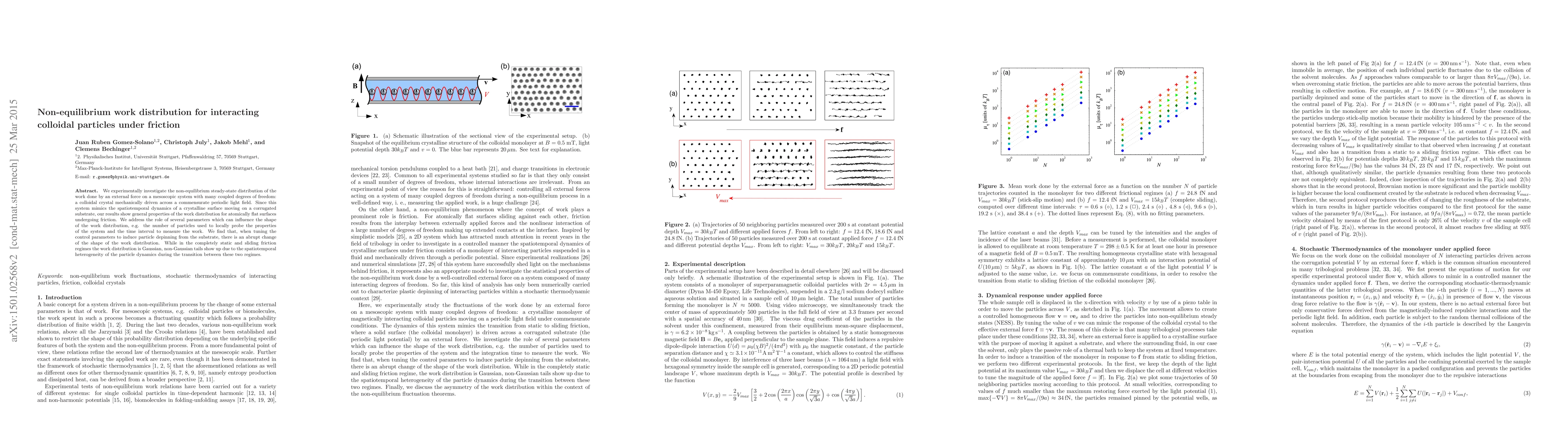We experimentally investigate the distribution of the non-equilibrium work done by an external force on a mesoscopic system with many coupled degrees of freedom: a colloidal monolayer mechanically driven across a periodic light field. Since this system mimics the spatiotemporal dynamics of a crystalline surface moving on a corrugated substrate, our results show general properties of the non-equilibrium work distribution of atomically flat surfaces undergoing friction. We address the role of several parameters which can influence the shape of the work distribution, e.g. the number of particles used to locally probe the system and the time interval to measure the work. We find that, when tuning the control parameters to induce particle depinning from the substrate, there is an abrupt change of the shape of the work distribution. While in the completely static and sliding friction regimes the work distribution is Gaussian, non-Gaussian tails show up due to the spatiotemporal heterogeneity of the particle dynamics during the transition between these two regimes.