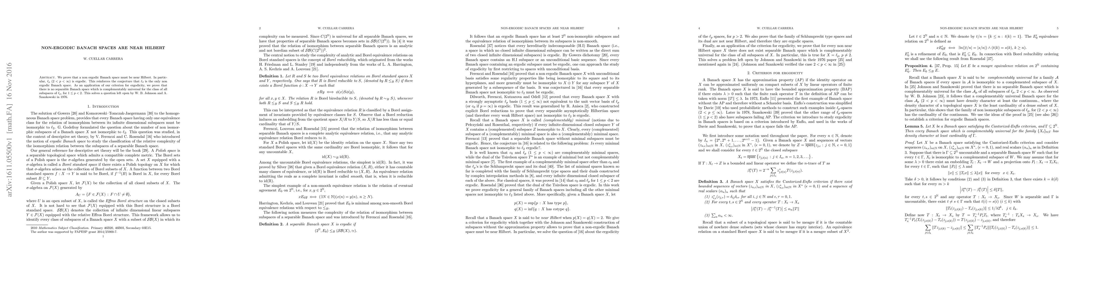 This paper proves that non-ergodic Banach spaces are structurally close to Hilbert spaces, specifically showing $\ell_p$ ($2<p<\infty$) is ergodic. It also resolves a 1976 question by proving no separable Banach space can be complementably universal for all subspaces of $\ell_p$ when $1\leq p <2$.
