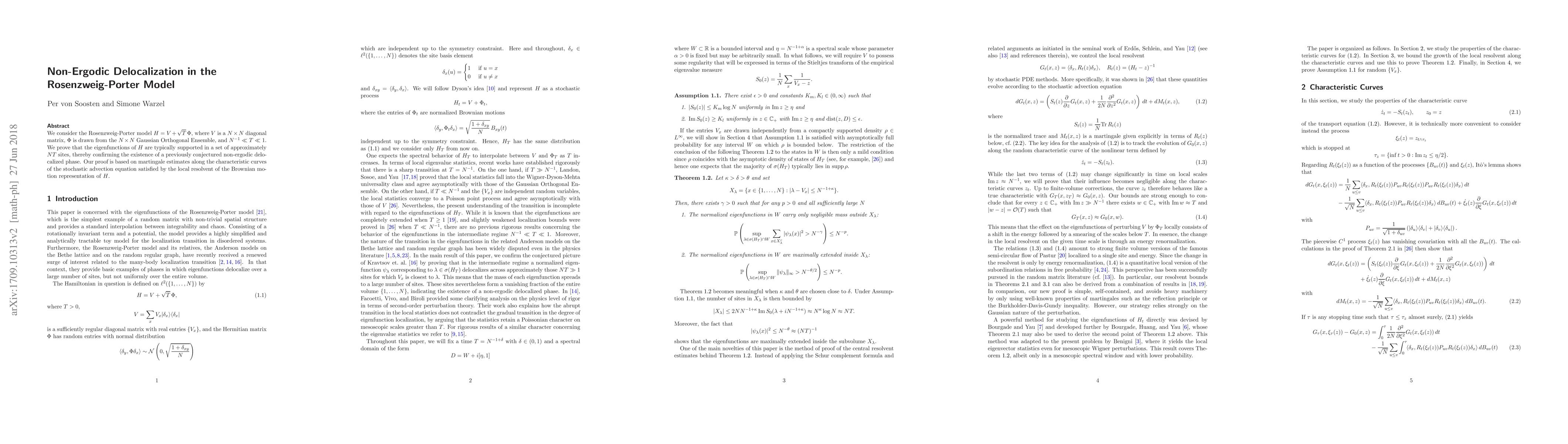 This paper proves the existence of a non-ergodic delocalized phase in the Rosenzweig-Porter model, showing that eigenfunctions are typically supported in a subset of approximately $NT$ sites. The proof leverages martingale estimates on the stochastic advection equation related to the local resolvent.