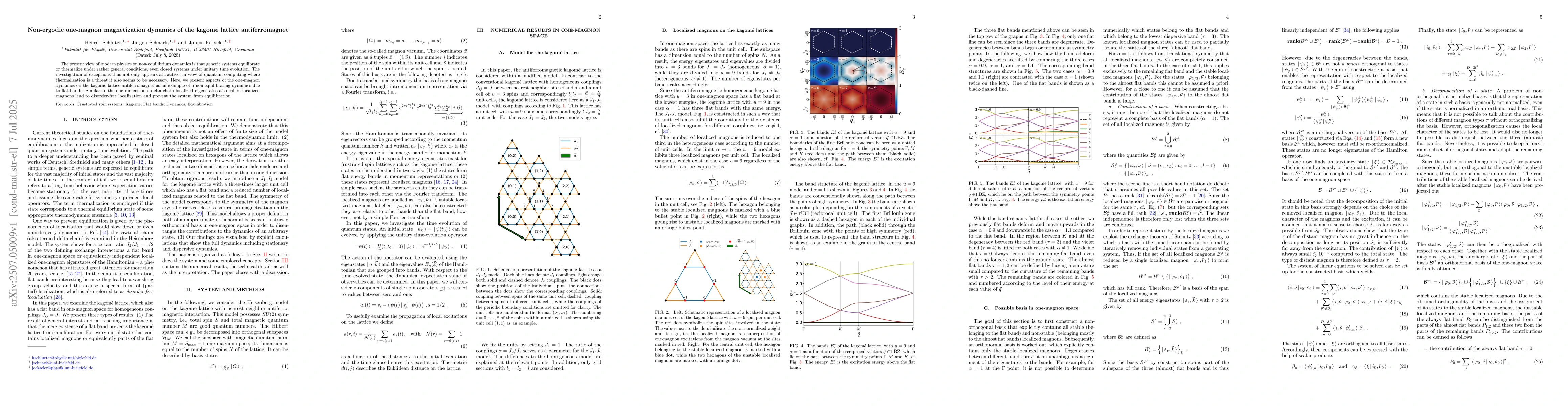 The present view of modern physics on non-equilibrium dynamics is that generic systems equilibrate or thermalize under rather general conditions, even closed systems under unitary time evolution. The investigation of exceptions thus not only appears attractive, in view of quantum computing where thermalization is a threat it also seems to be necessary. Here, we present aspects of the one-magnon dynamics on the kagome lattice antiferromagnet as an example of a non-equilibrating dynamics due to flat bands. Similar to the one-dimensional delta chain localized eigenstates also called localized magnons lead to disorder-free localization and prevent the system from equilibration.