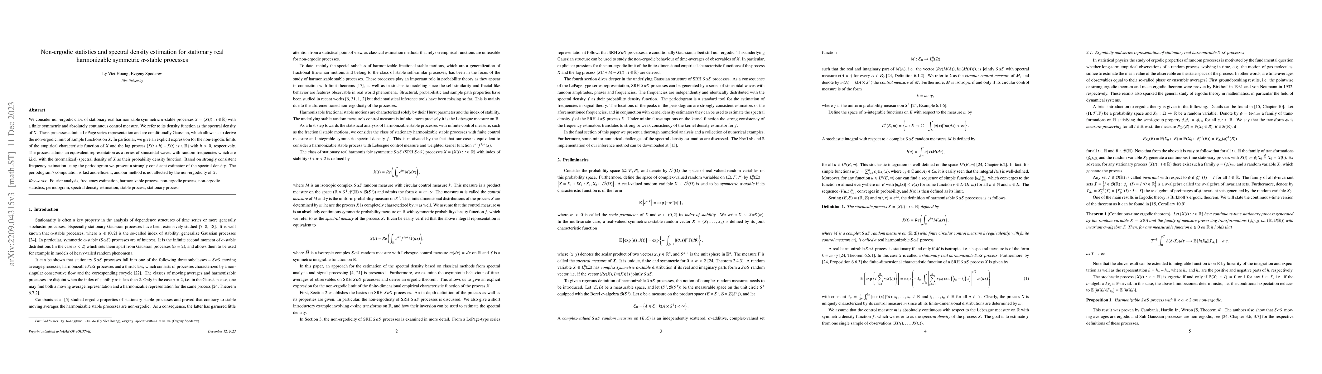 This paper studies non-ergodic stationary real harmonizable symmetric $\alpha$-stable processes, deriving explicit expressions for their non-ergodic limits and presenting a strongly consistent estimator for their spectral density using the periodogram, which remains efficient despite the non-ergodicity.