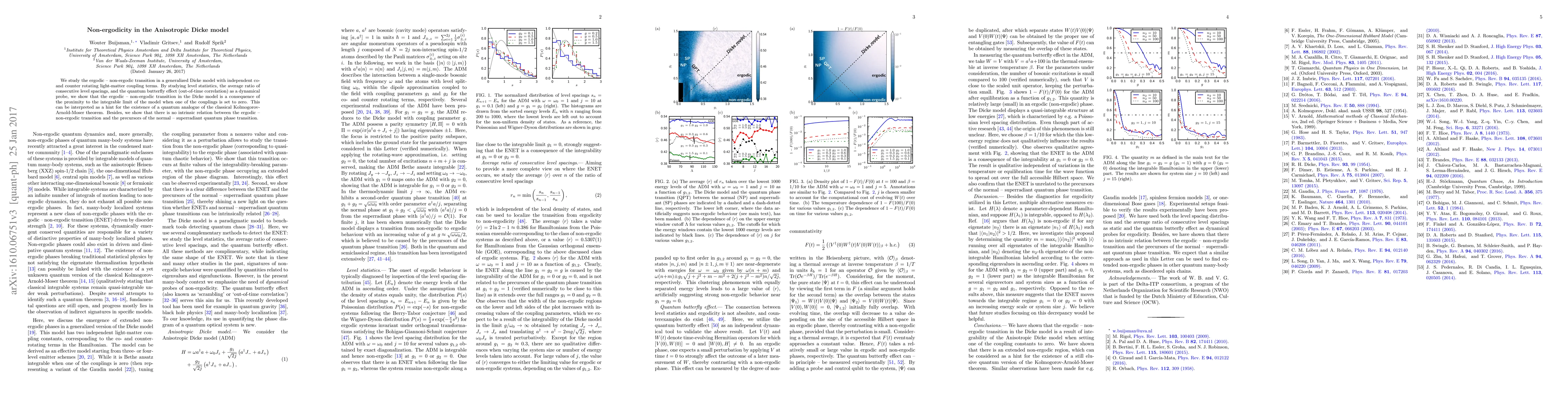 This paper investigates the ergodic-non-ergodic transition in the Anisotropic Dicke model, demonstrating that it arises near the integrable limit when one coupling term is zero. The study uses level statistics and quantum butterfly effect as probes, suggesting a quantum analogue of the Kolmogorov-Arnold-Moser theorem, and finds no link to the normal-superradiant quantum phase transition.