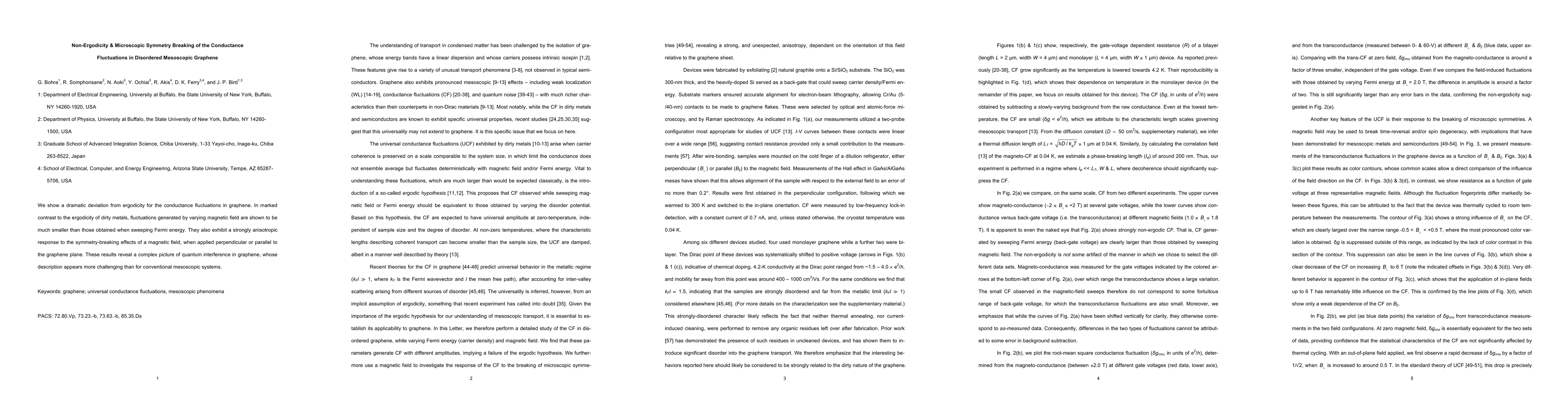 We show a dramatic deviation from ergodicity for the conductance fluctuations in graphene. In marked contrast to the ergodicity of dirty metals, fluctuations generated by varying magnetic field are shown to be much smaller than those obtained when sweeping Fermi energy. They also exhibit a strongly anisotropic response to the symmetry-breaking effects of a magnetic field, when applied perpendicular or parallel to the graphene plane. These results reveal a complex picture of quantum interference in graphene, whose description appears more challenging than for conventional mesoscopic systems.