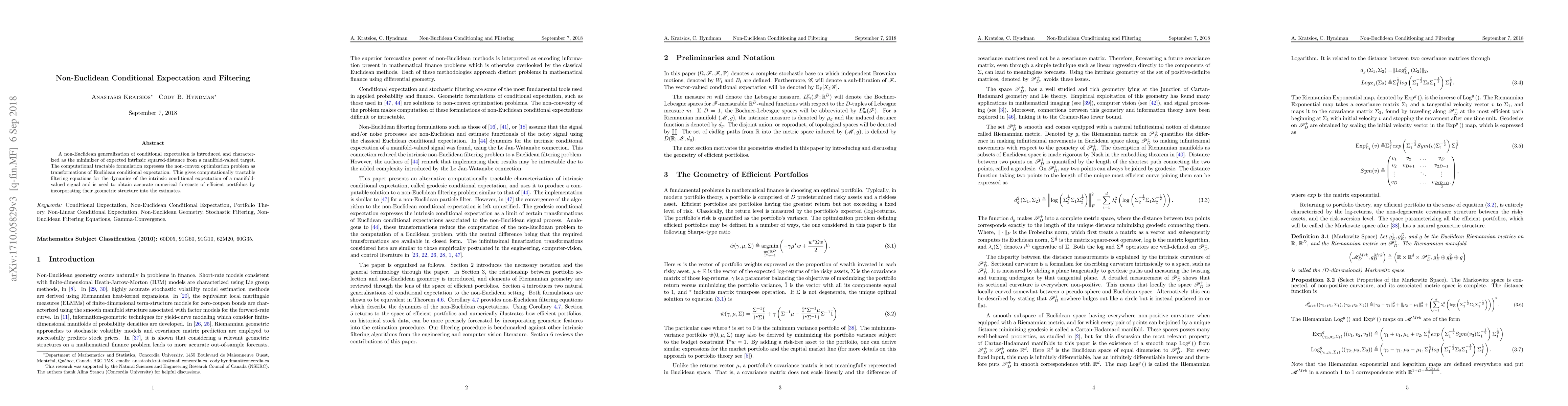 A non-Euclidean generalization of conditional expectation is introduced and characterized as the minimizer of expected intrinsic squared-distance from a manifold-valued target. The computational tractable formulation expresses the non-convex optimization problem as transformations of Euclidean conditional expectation. This gives computationally tractable filtering equations for the dynamics of the intrinsic conditional expectation of a manifold-valued signal and is used to obtain accurate numerical forecasts of efficient portfolios by incorporating their geometric structure into the estimates.